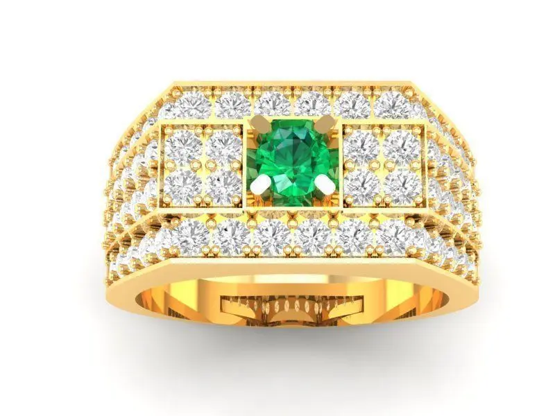 This 3D model showcases a luxury men's statement ring featuring a bold rectangular face adorned with a central gemstone, such as emerald or ruby, surrounded by multiple rows of sparkling diamonds. The wide band and strong geometric design highlight masculinity and prestige, making it an ideal choice for men seeking an impressive jewelry piece.