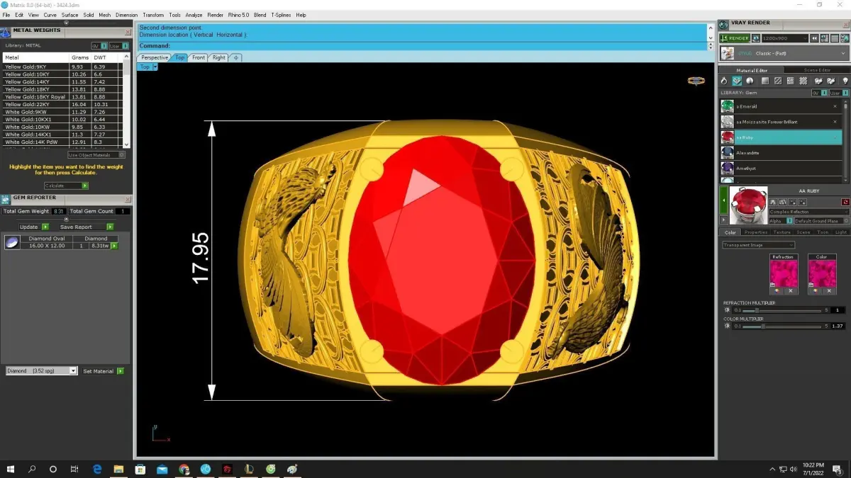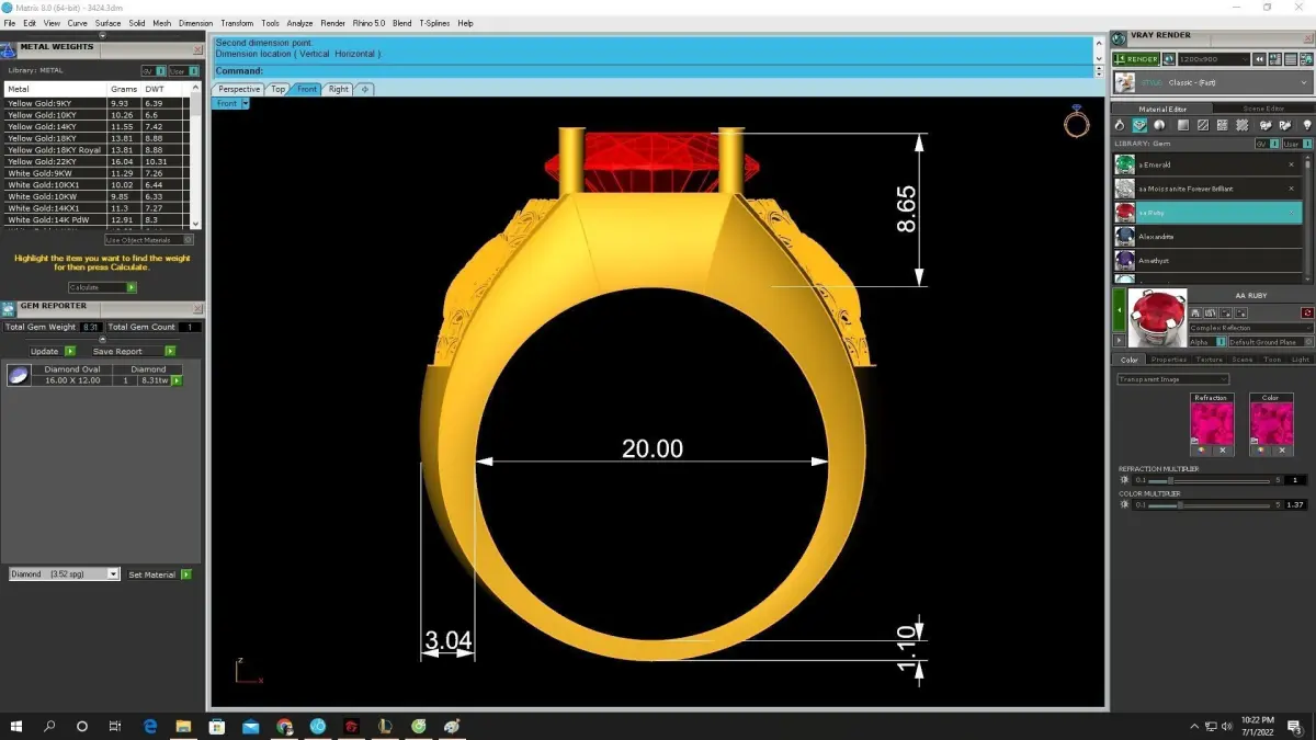 The ring includes clean topology, correct thicknesses, and optimized geometry suitable for CNC milling, lost-wax casting, and 3D printing workflows. All measurements, including gemstone size and ring dimensions, are clearly displayed in the preview renders, ensuring professional makers can achieve accurate results.