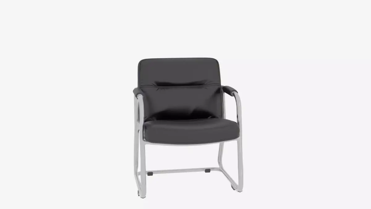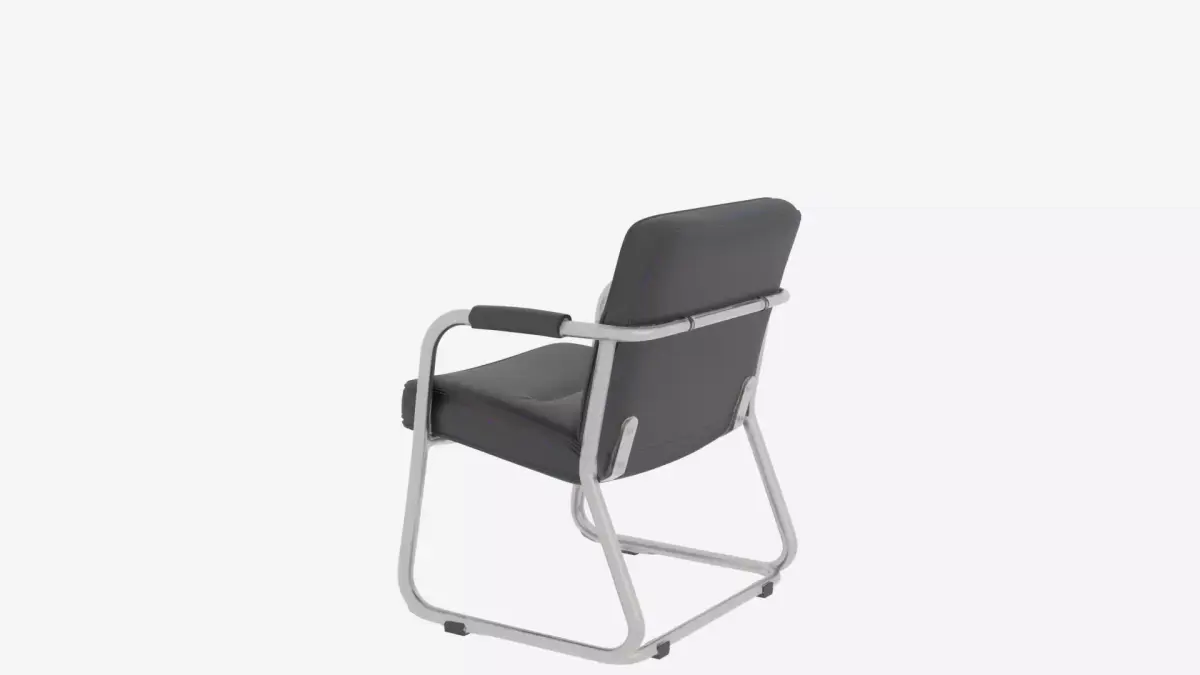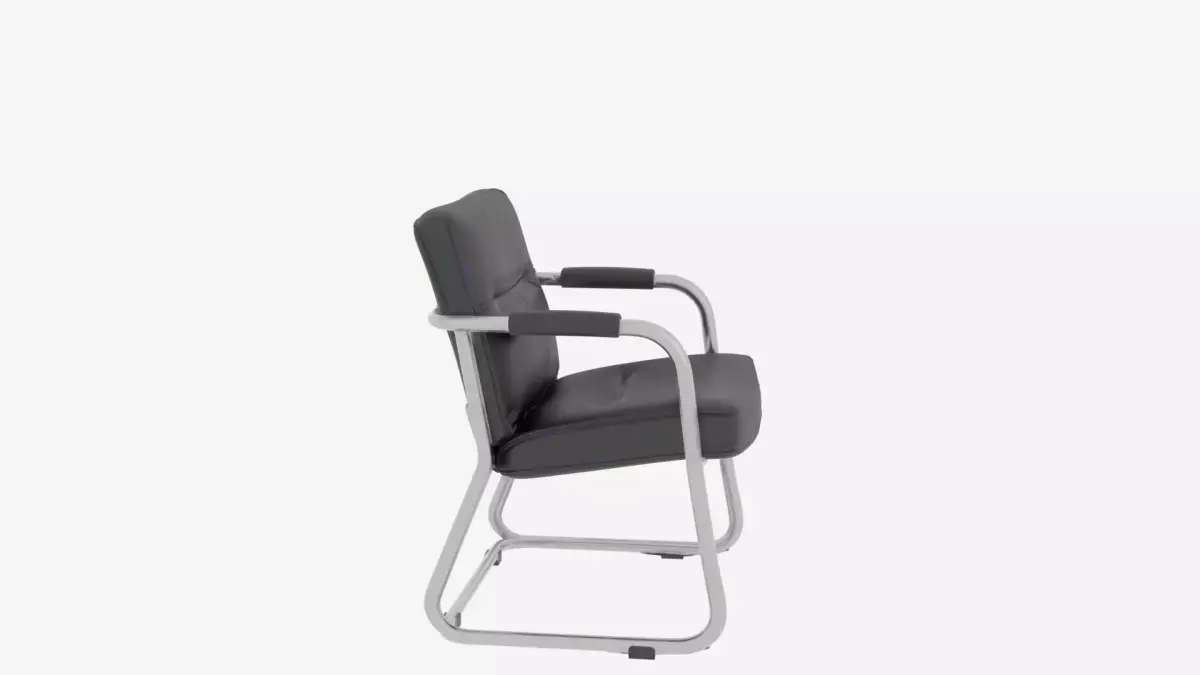 A sleek contemporary bank lobby chair featuring a gleaming chrome tubular frame, luxurious black leather upholstery with precise stitching details, and an ergonomic design for ultimate comfort. The chair includes a weighted base for superior stability, polished chrome reflections that catch the light beautifully, rubber floor protectors to prevent damage, and subtle cushion indentations that showcase premium craftsmanship. Designed with attention to every joint, seam, and proportion for authentic modern banking interior aesthetics that exude sophistication and professionalism while maintaining exceptional durability for high-traffic environments and presenting four detailed views for comprehensive 3D modeling with accurate material properties and shadow casting capabilities.
