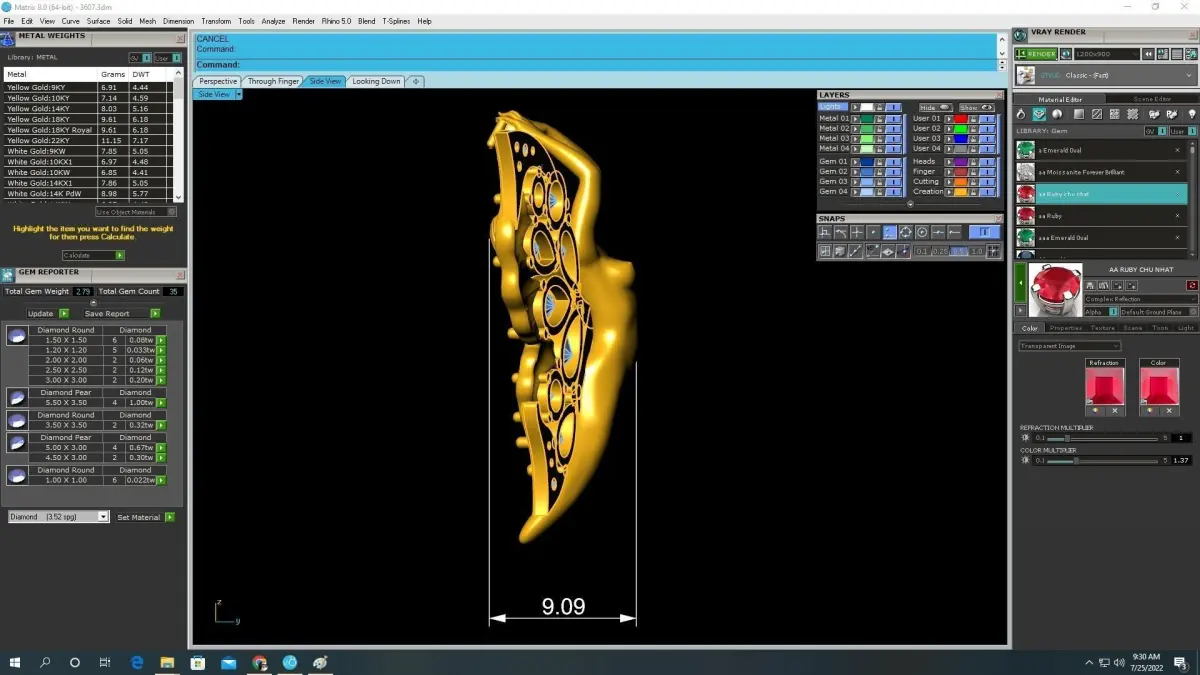 This professional 3D jewelry model is fully prepared for casting and production. Detailed technical images are included to display exact dimensions, estimated metal weight, and stone layout, enabling jewelers and manufacturers to accurately evaluate production requirements and material usage.