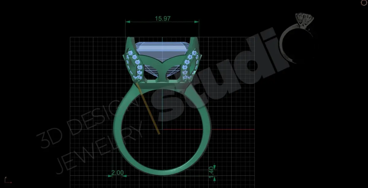 The ring has 59 gems on - gem sizes are 1mm, 1.1mm, 1.2mm and 1.4mm diameter and the main one is 20.2x15.2mm diameter