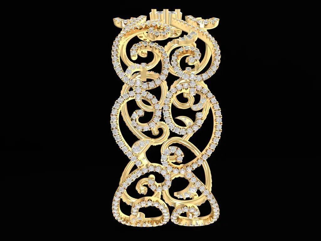 This 3D jewelry model showcases a stunning filigree-style bracelet designed with flowing curves and intricate details. The elegant scroll pattern is beautifully set with sparkling diamonds that highlight the bracelet’s luxurious craftsmanship. With its artistic openwork and symmetrical design, this piece perfectly balances classic beauty and contemporary sophistication.