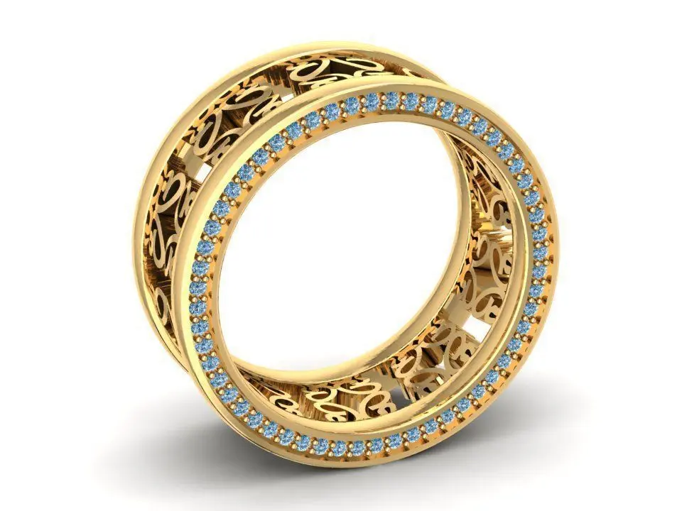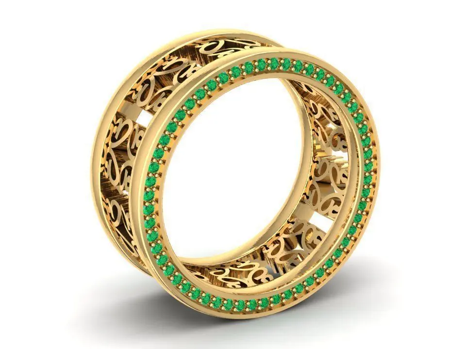 This luxury filigree eternity band ring features an intricate openwork design with detailed filigree patterns, accented by a continuous row of sparkling gemstones along the edges. The ring can be set with diamonds, rubies, emeralds, or sapphires, offering versatile customization for both men and women.