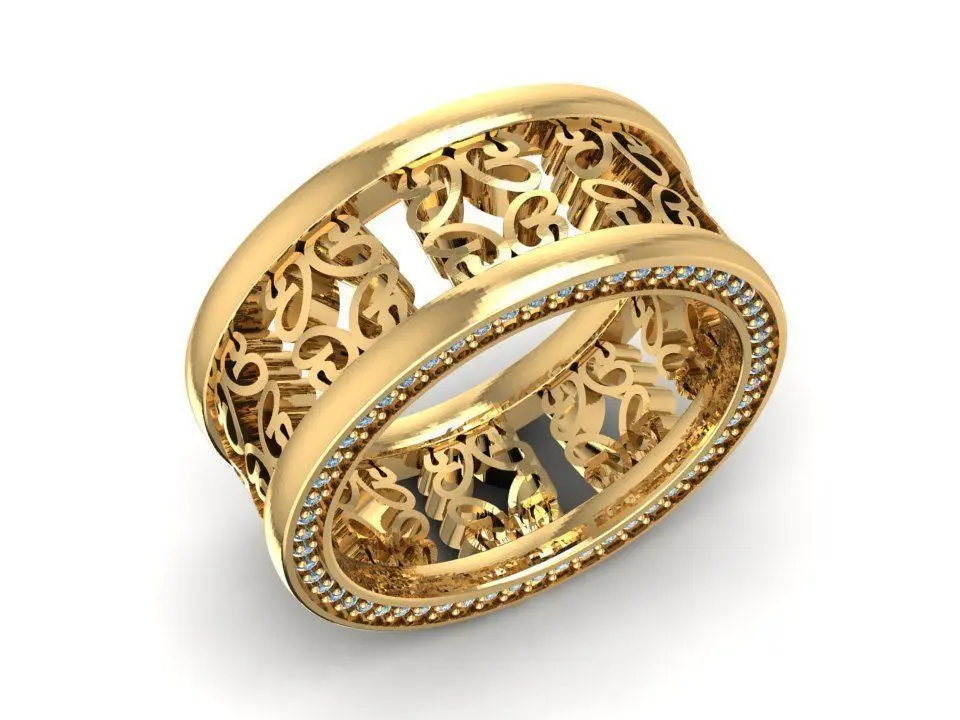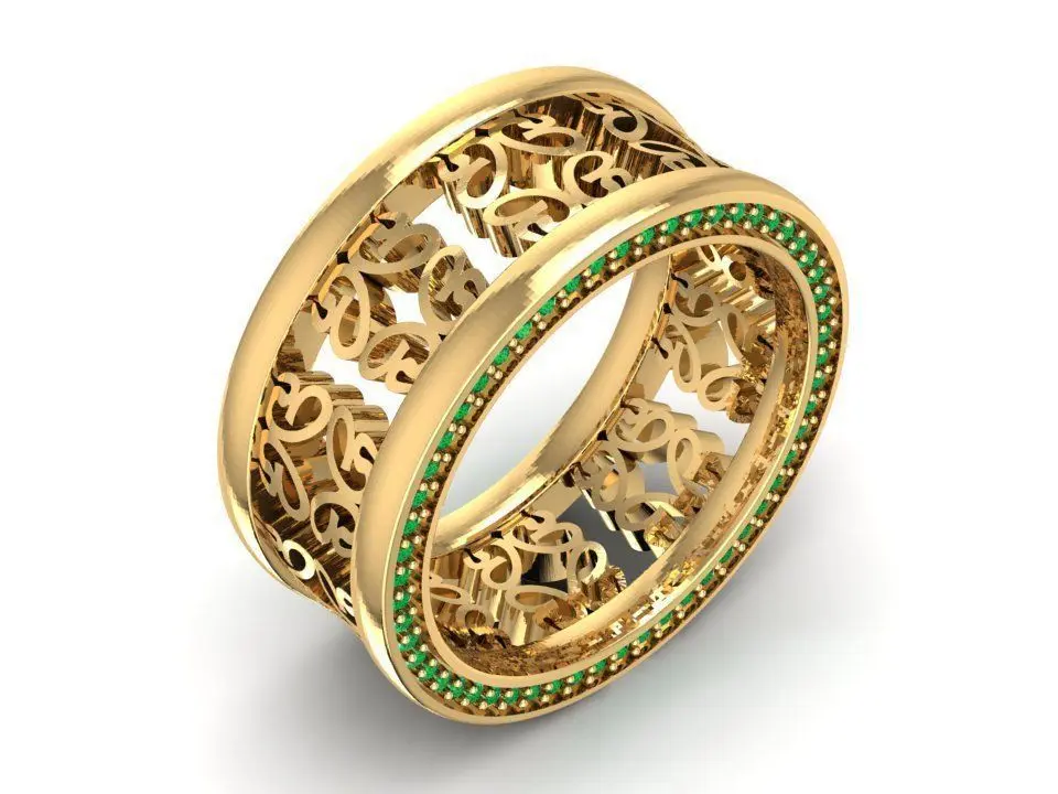Its wide band and refined craftsmanship make it suitable as a wedding band, fashion statement, or anniversary gift. The timeless filigree pattern adds elegance and character, while the gemstone border provides brilliance and luxury.
