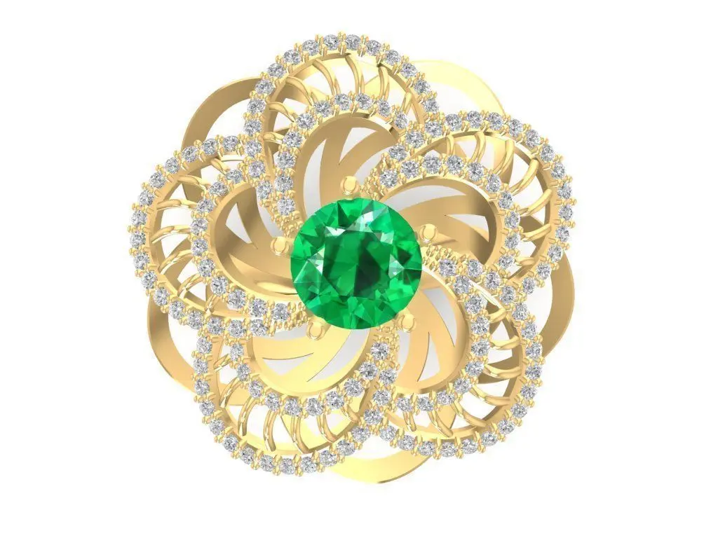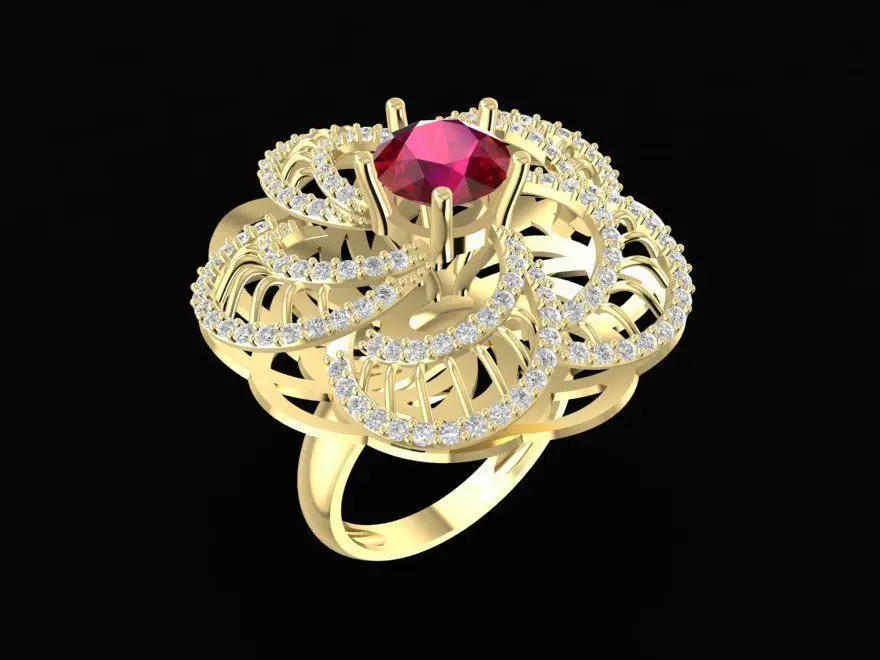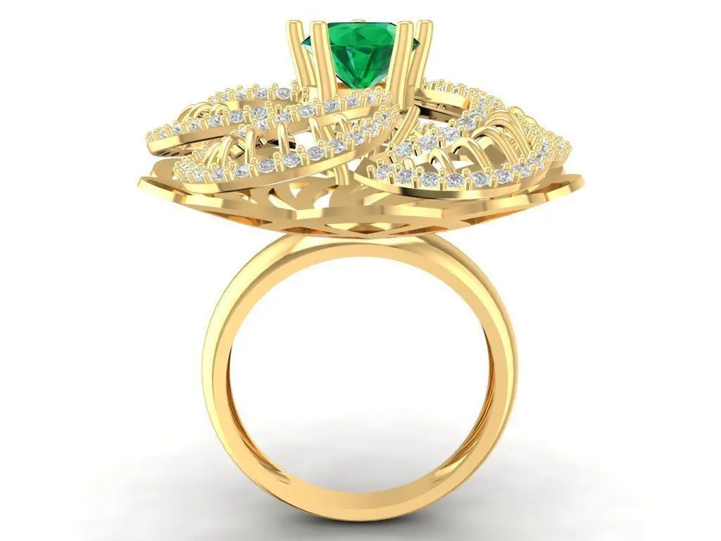 This 3D model showcases a luxury cocktail ring designed with an intricate flower-inspired filigree structure. The centerpiece features a brilliant round gemstone, available in ruby red or emerald green, set in a secure prong mount. The artistic openwork petals are accented with pavé stones, creating a bold and elegant look. This design is ideal for statement rings, cocktail jewelry, or high-end fashion accessories. The model includes accurate dimensions and gold weight details for multiple alloys, optimized for professional jewelry manufacturing, 3D printing, and rendering.