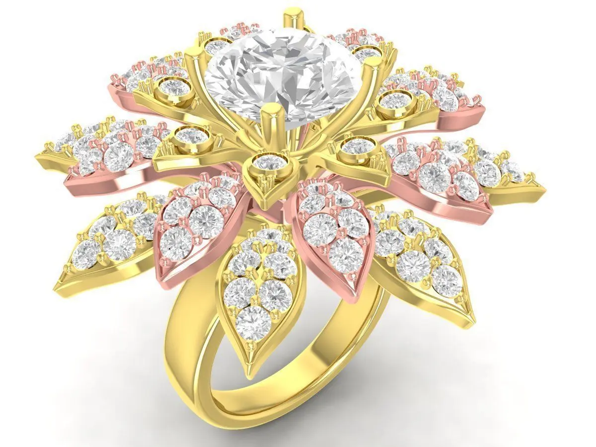 This luxury floral cluster ring 3D model features an elegant multi-layer flower design with a large round center stone surrounded by marquise and round accent stones. The composition creates a rich, blooming effect, delivering strong brilliance and high visual impact from every angle.