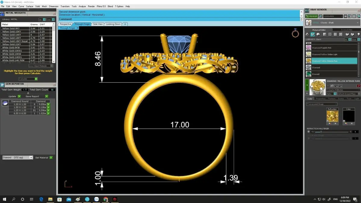 This 3D jewelry model is optimized for precious metal casting such as gold or silver and supports various gemstone combinations. All technical information including dimensions, stone sizes, and estimated metal weight is clearly displayed in the preview images.