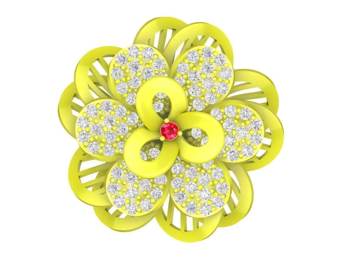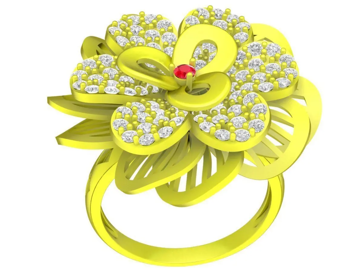 This luxury floral cluster ring 3D model features an elegant flower-inspired design with multiple layered petals set with round gemstones. The openwork structure creates depth and lightness while highlighting the brilliance of the clustered stones.
