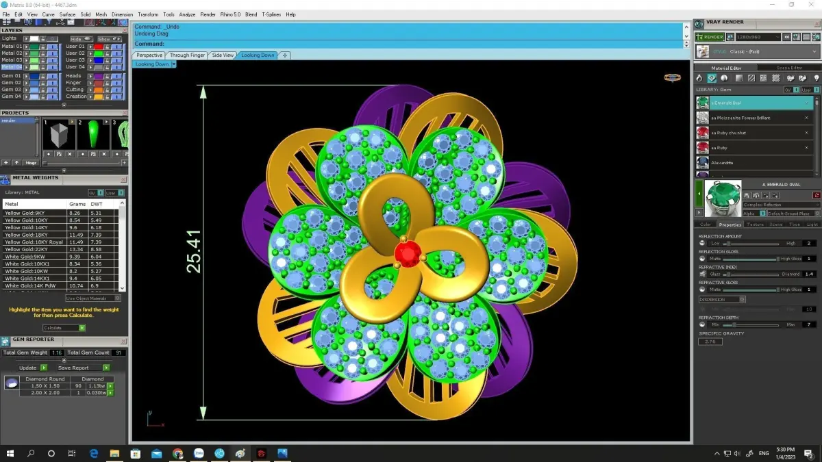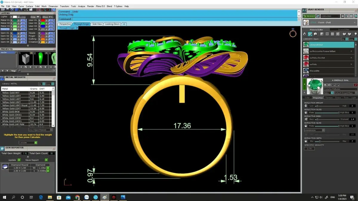 All preview images clearly display dimensions, stone sizes, stone quantity, and metal weight. The model is fully prepared for lost-wax casting and professional jewelry manufacturing.