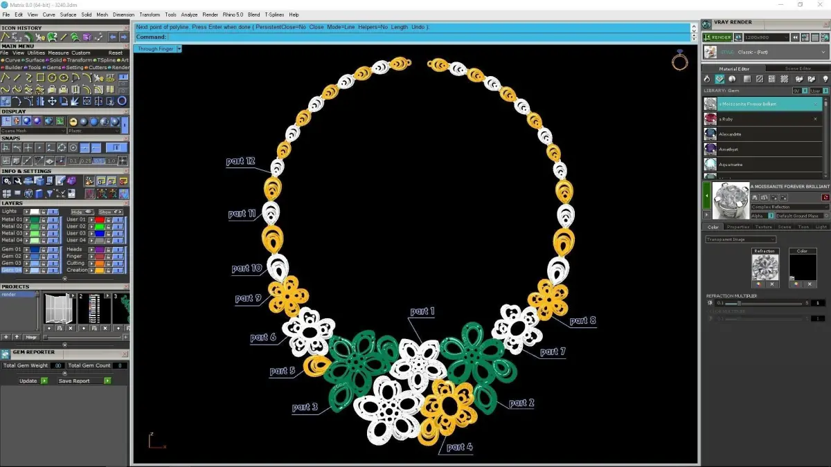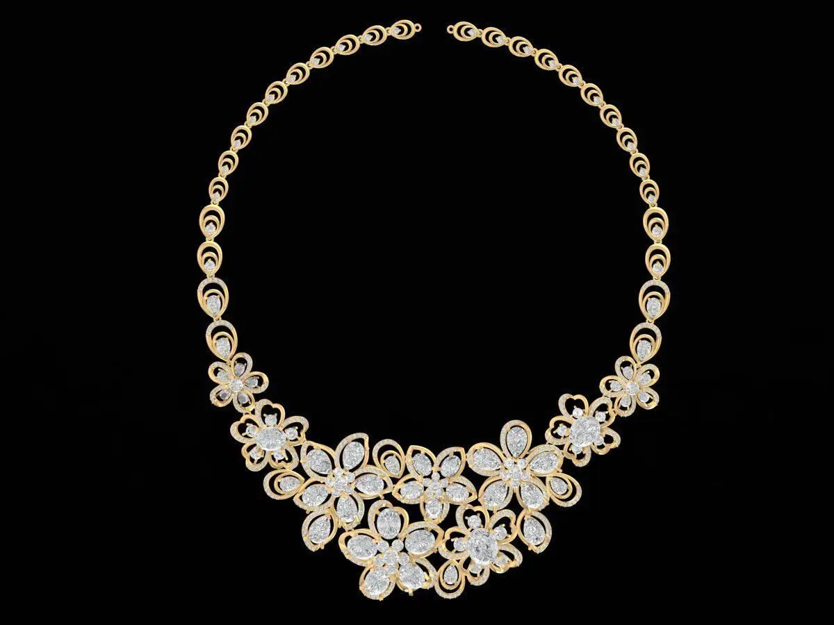 This Luxury Floral Diamond Necklace Jewelry model features an elegant botanical concept designed for high-end jewelry collections. The necklace combines multiple flower clusters arranged harmoniously around the neckline, creating a bold yet graceful statement piece suitable for premium fashion and bridal jewelry. Each petal and center stone is carefully modeled with accurate seat geometry, ensuring precise stone placement and professional-level production quality.