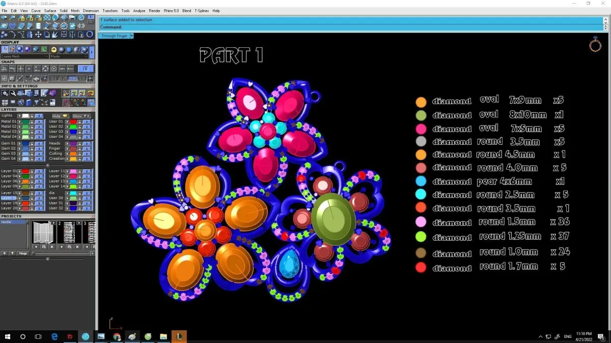The CAD structure includes detailed measurements, gemstone specifications, and exploded views for each flower component, allowing jewelers and manufacturers to evaluate assembly and casting feasibility. Stones include round, marquise, pear, and oval cuts, arranged to maximize brilliance and create a three-dimensional floral effect. The model maintains balanced wall thickness, clean topology, and smooth organic transitions, making it suitable for printing in gold, silver, or platinum.