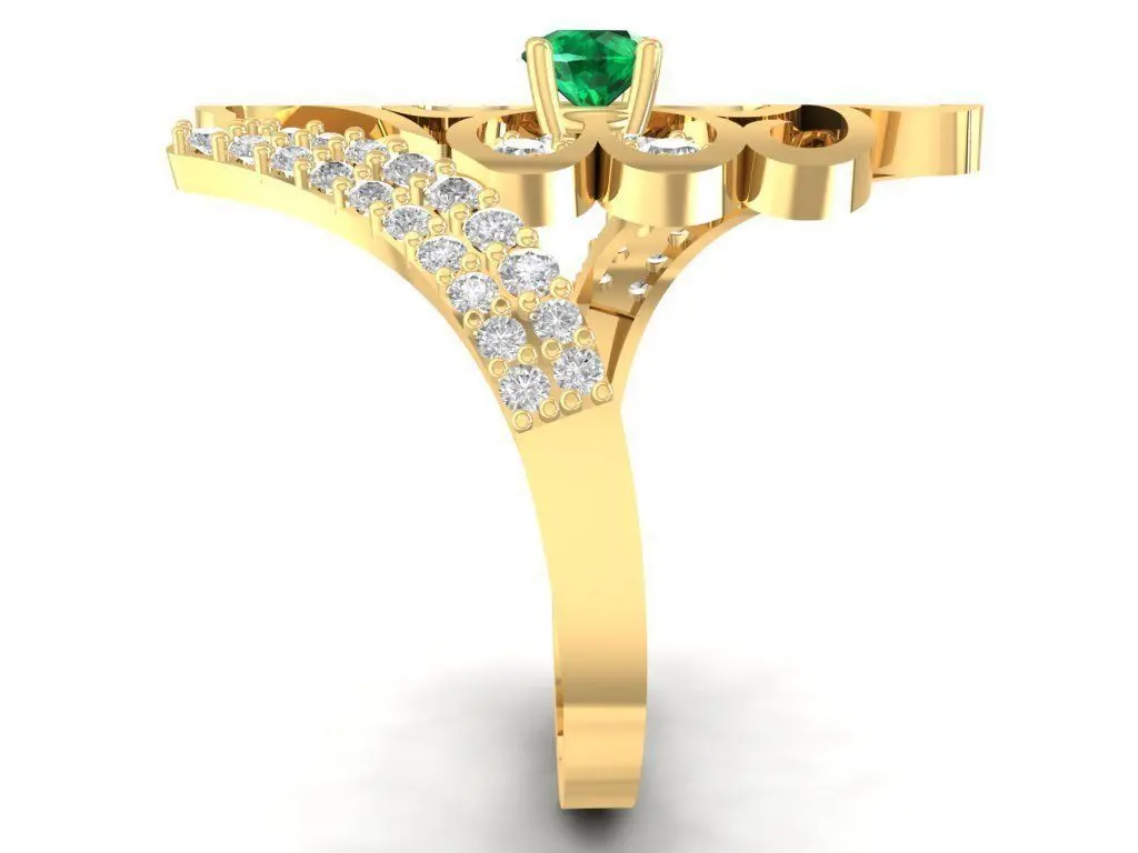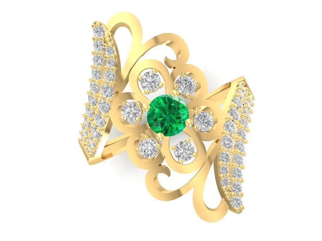 This 3D jewelry model showcases a luxury floral emerald diamond ring for women, designed with an elegant flower motif at the center. The main gemstone, set in the middle of the floral structure, is highlighted by surrounding diamond accents that create a brilliant sparkle. The band is further enhanced with rows of pavé-set stones, offering both sophistication and glamour.