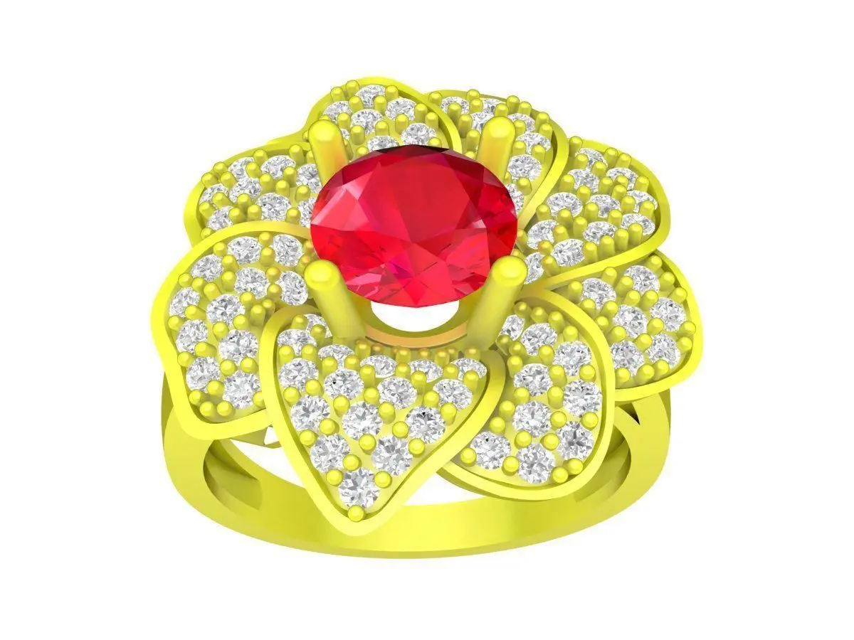 The ring is designed with a raised center setting to highlight the main stone, while multiple rows of pavé diamonds add texture and sparkle across the petals. The slim and well-balanced shank provides comfort and stability, making the design suitable for statement rings, cocktail rings, or engagement-style jewelry.