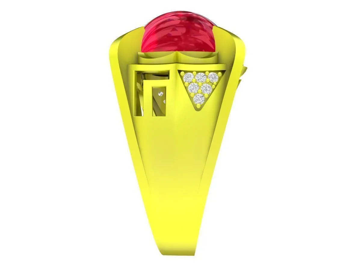 This luxury floral ruby ring is designed for men who appreciate bold artistry combined with refined jewelry craftsmanship. The ring features a prominent oval-cut center stone in a vivid ruby style, securely held by sculpted petal-like prongs that form a powerful floral-inspired crown.