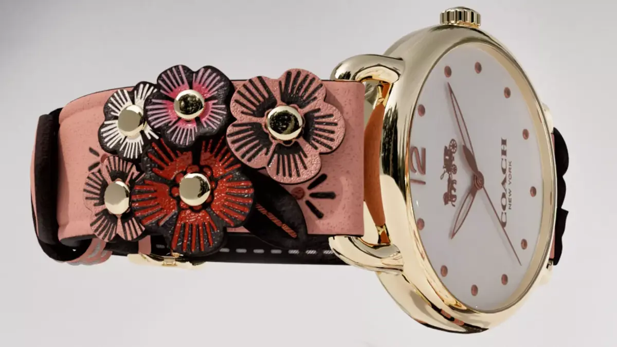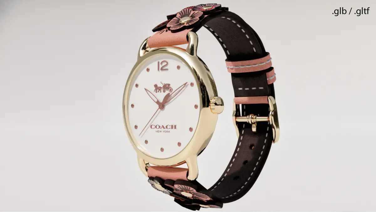 Women's watches for true connoisseurs of beauty!This is a high-quality, realistic 3D model of a luxury wristwatch (inspired by iconic designer brands like Coach) featuring a gold-finished round case, minimalist dial, and a unique leather strap decorated with floral appliqués. This model is perfect for product visualization, e-commerce, virtual try-ons, and detailed close-up renders.