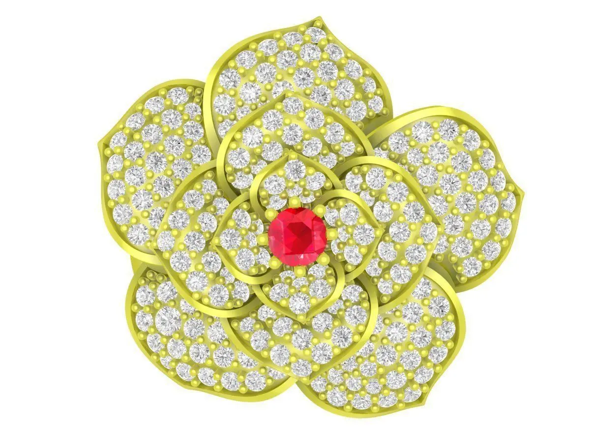 This luxury flower diamond cluster ring 3D model features an elegant floral design with layered petals fully pavé-set with round diamonds. A vivid round center stone sits at the heart of the flower, creating strong visual focus and enhanced brilliance.
