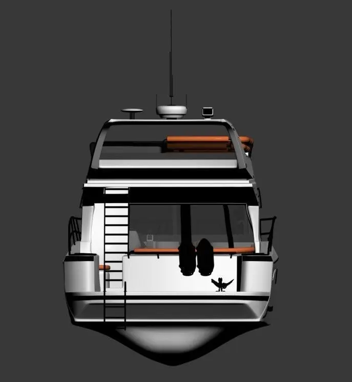 Dual-level design with enclosed main salon and elevated flybridgeUpper flybridge equipped with helm controls, seating, and protective hardtopRealistic details including black fenders, stainless steel railings, porthole windows, and antenna mastClean white hull with modern lines and subtle black accents for a sophisticated lookOpen aft deck and swim platform area for easy water access