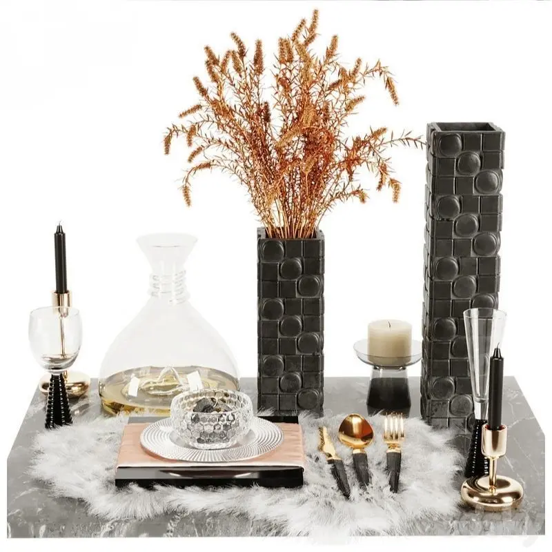 Elevate your dining experience with this sophisticated table setting. The centerpiece features two tall, black textured vases, one adorned with dried orange-brown botanicals, adding a touch of nature to the modern aesthetic. A small white candle nestled between the vases creates a warm, inviting ambiance.