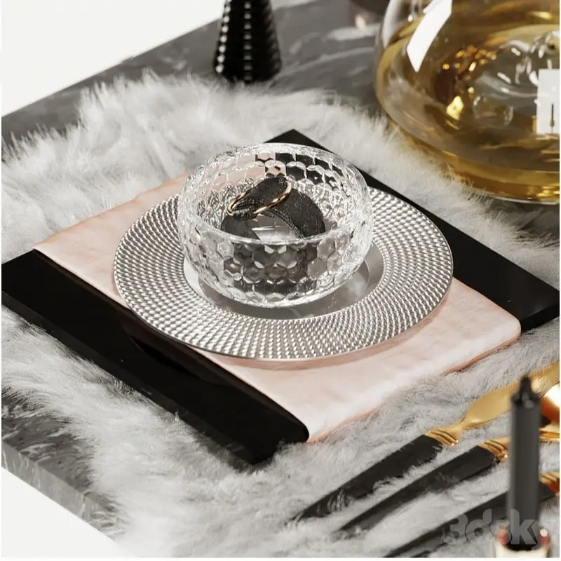 The arrangement is completed with two black candle holders, each holding an unlit tapered candle, positioned at opposite ends of the gray rectangular tray. The soft gray fur table runner beneath the tray adds a luxurious texture, contrasting beautifully with the sleek surfaces of the glassware and plates.