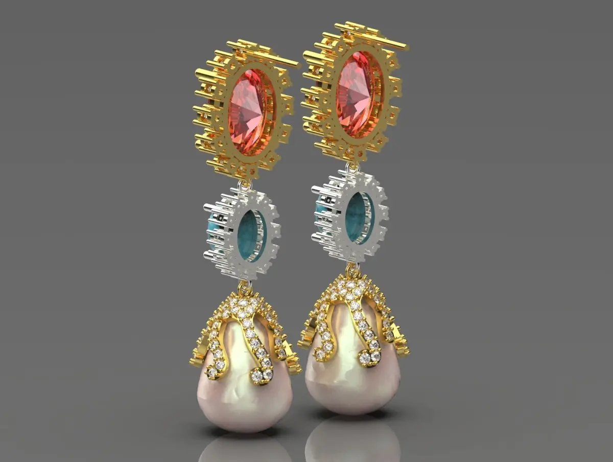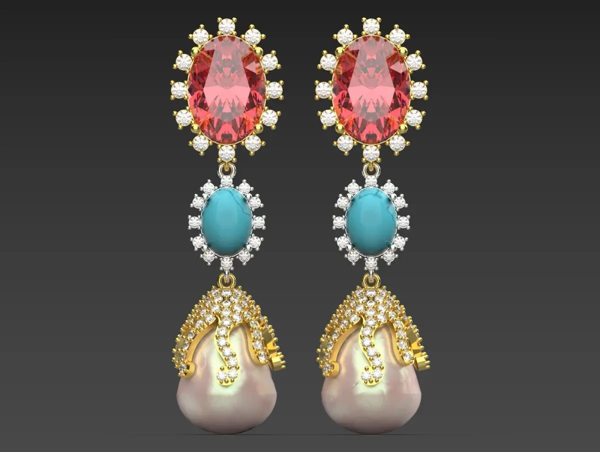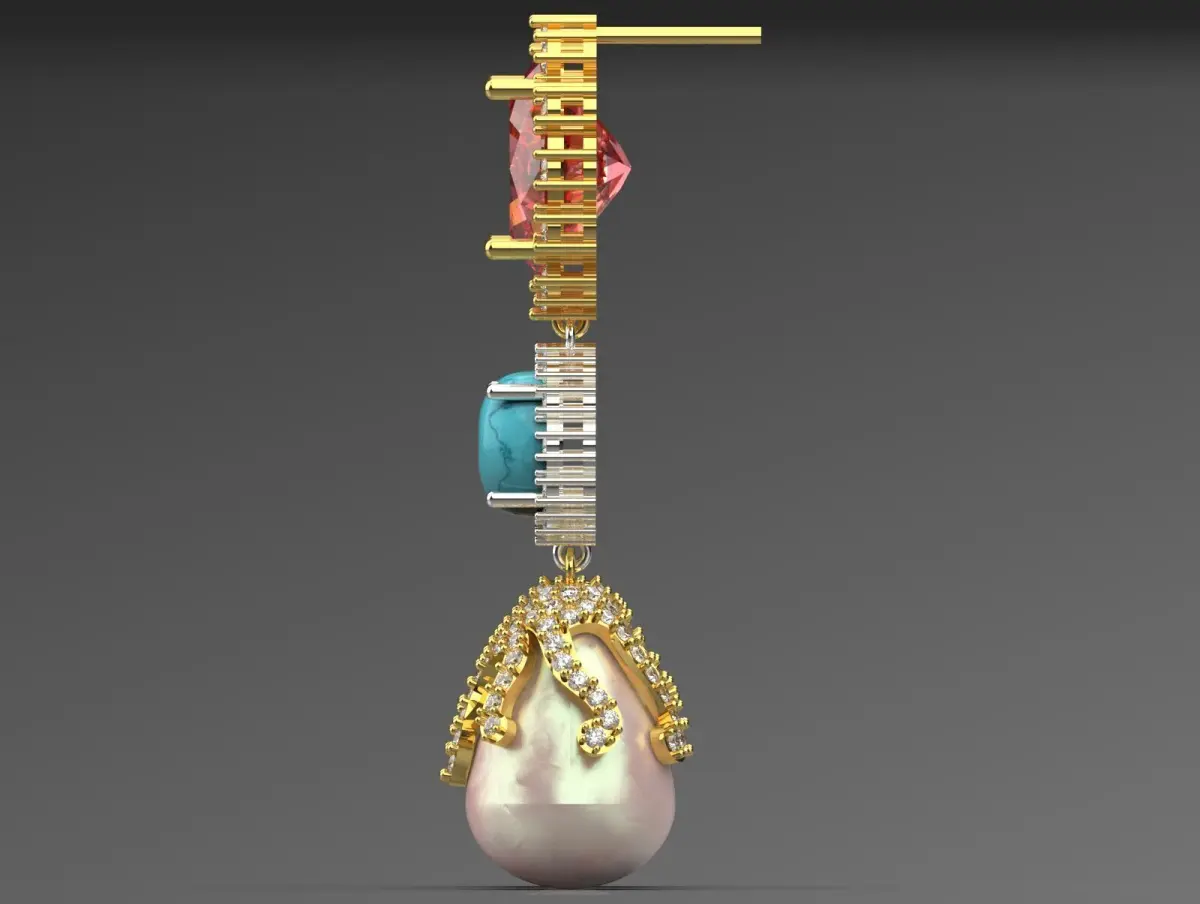 These earrings showcase a vibrant and intricate design that combines multiple elements for a stunning look. At the top, they feature large, sparkling red gemstones set in a gold frame, radiating elegance. Below the reds, there's a striking turquoise stone surrounded by silver accents, adding a pop of color and contrast. The lower part of the earrings culminates in a luxurious pearl, embellished with gold filigree that creates an ornate and flowing appearance. The combination of colors, textures, and shapes makes these earrings a bold statement piece suitable for special occasions or adding flair to any outfit.