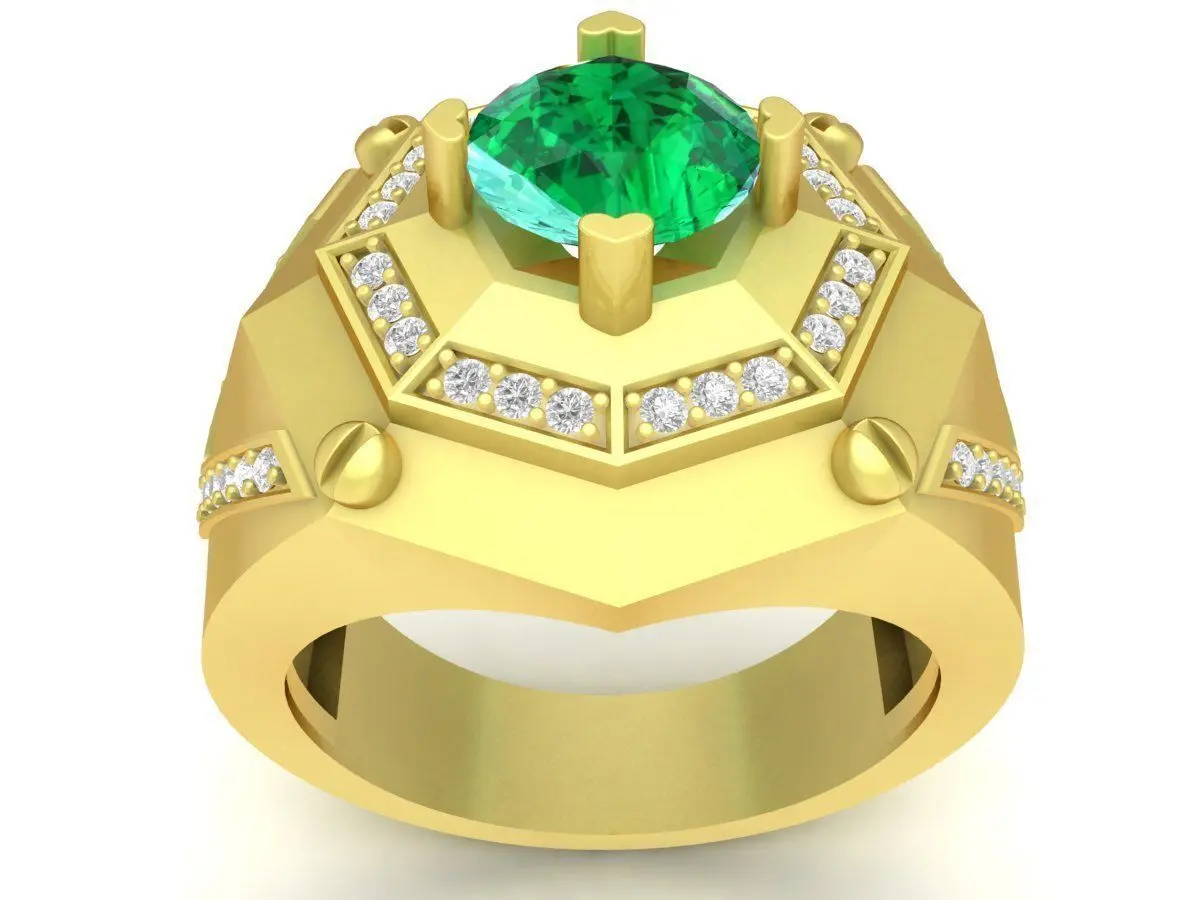 This luxury geometric gemstone ring is a bold and modern 3D jewelry design created for professional manufacturing and high-end men’s jewelry collections. The ring features a distinctive multi-sided geometric top, set with a prominent center gemstone and surrounded by precisely arranged accent diamonds that enhance brilliance and visual depth.