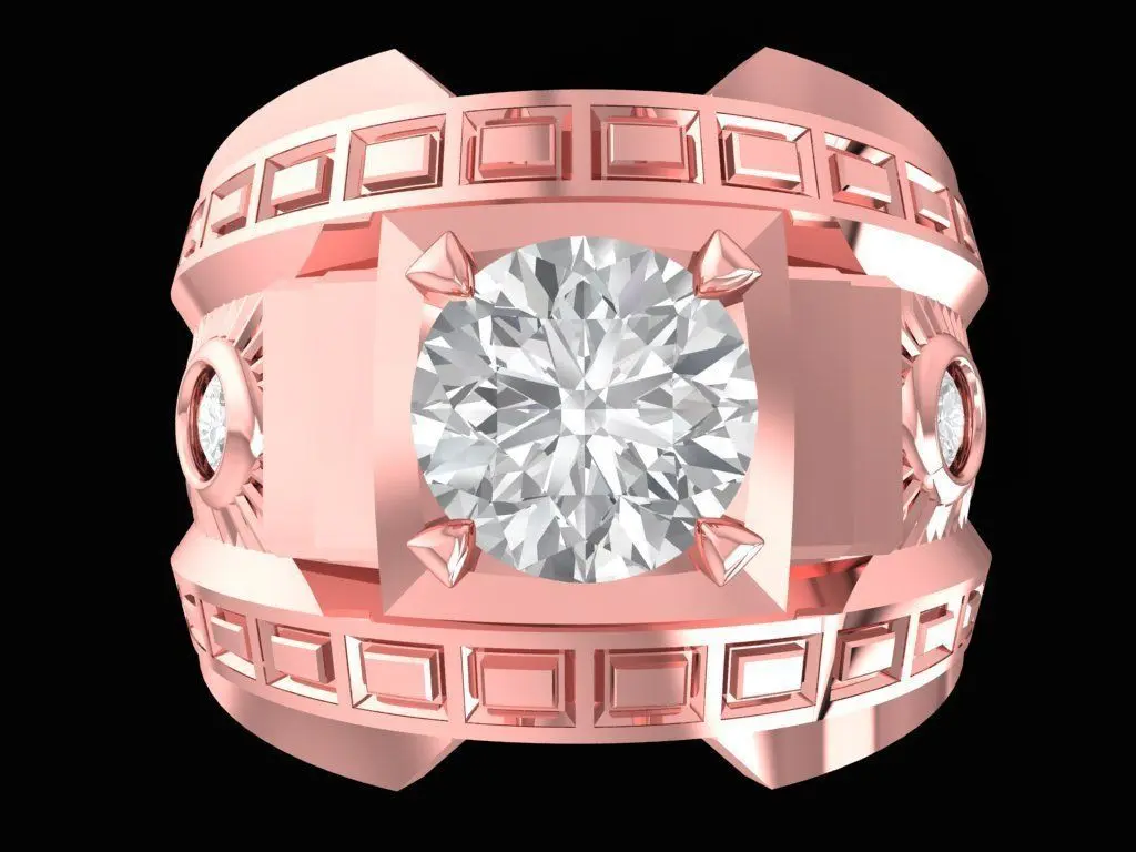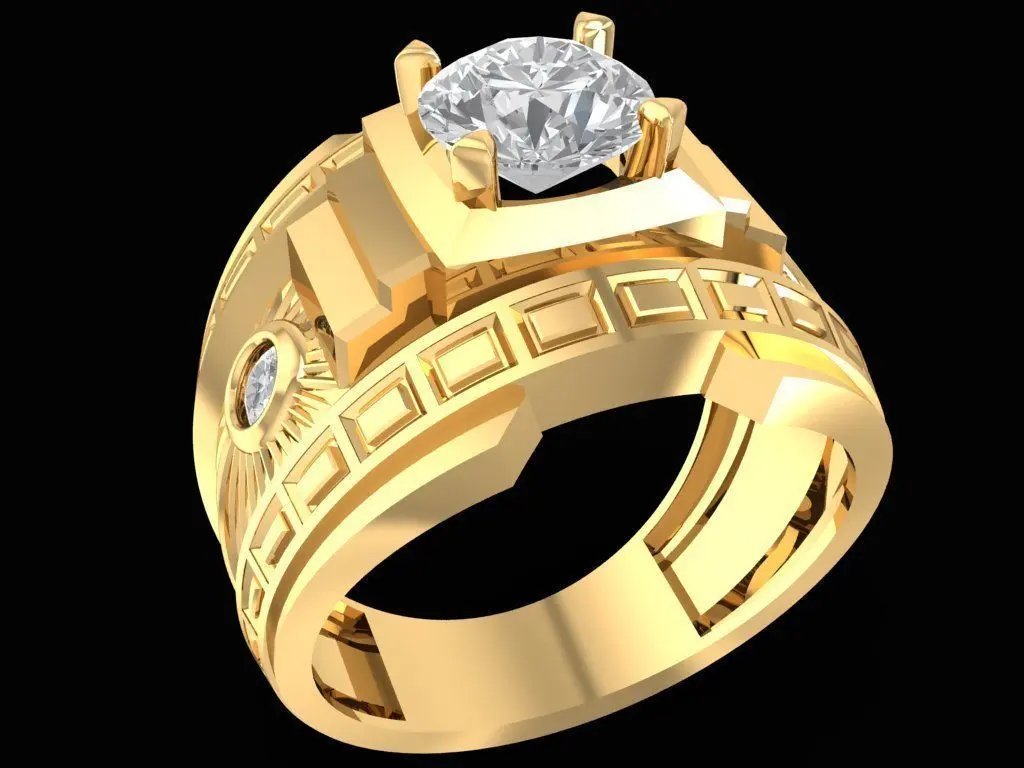 This luxury geometric men ring features a bold architectural design with a striking round brilliant diamond at the center. The ring showcases strong masculine lines, symmetrical patterns, and a meticulously crafted band that highlights both elegance and power. Each surface is polished to perfection, giving the piece an impressive reflective effect.