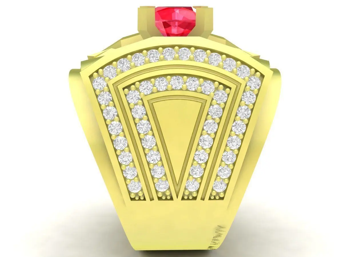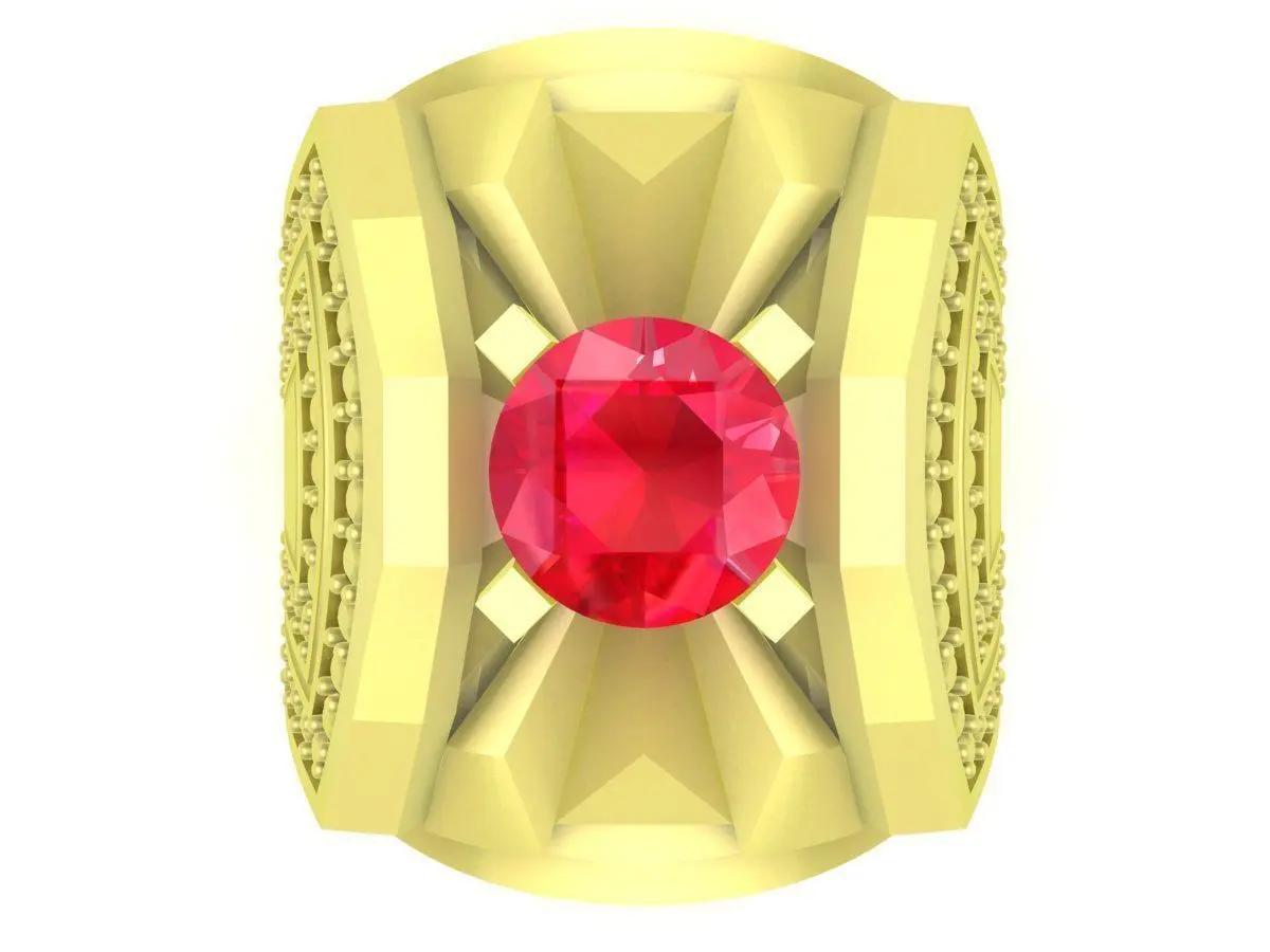 This is a premium 3D jewelry model of a luxury men’s ring featuring a round center stone set in a bold geometric design. The ring head is sculpted with sharp, faceted surfaces that reflect light strongly, creating a powerful and masculine appearance.
