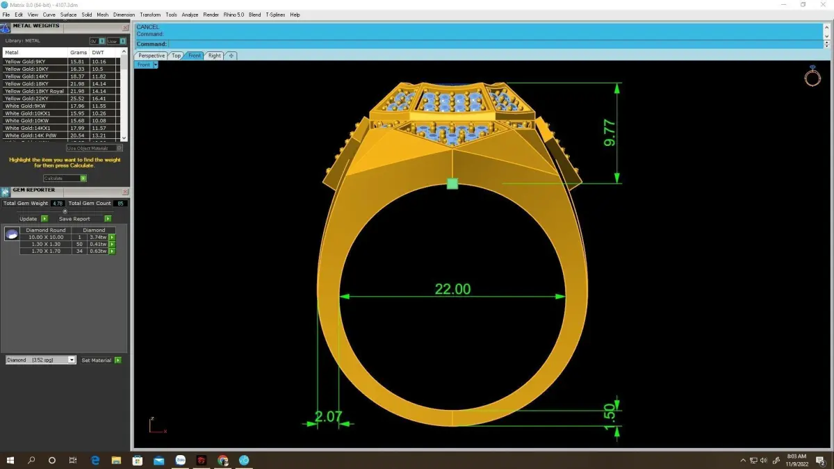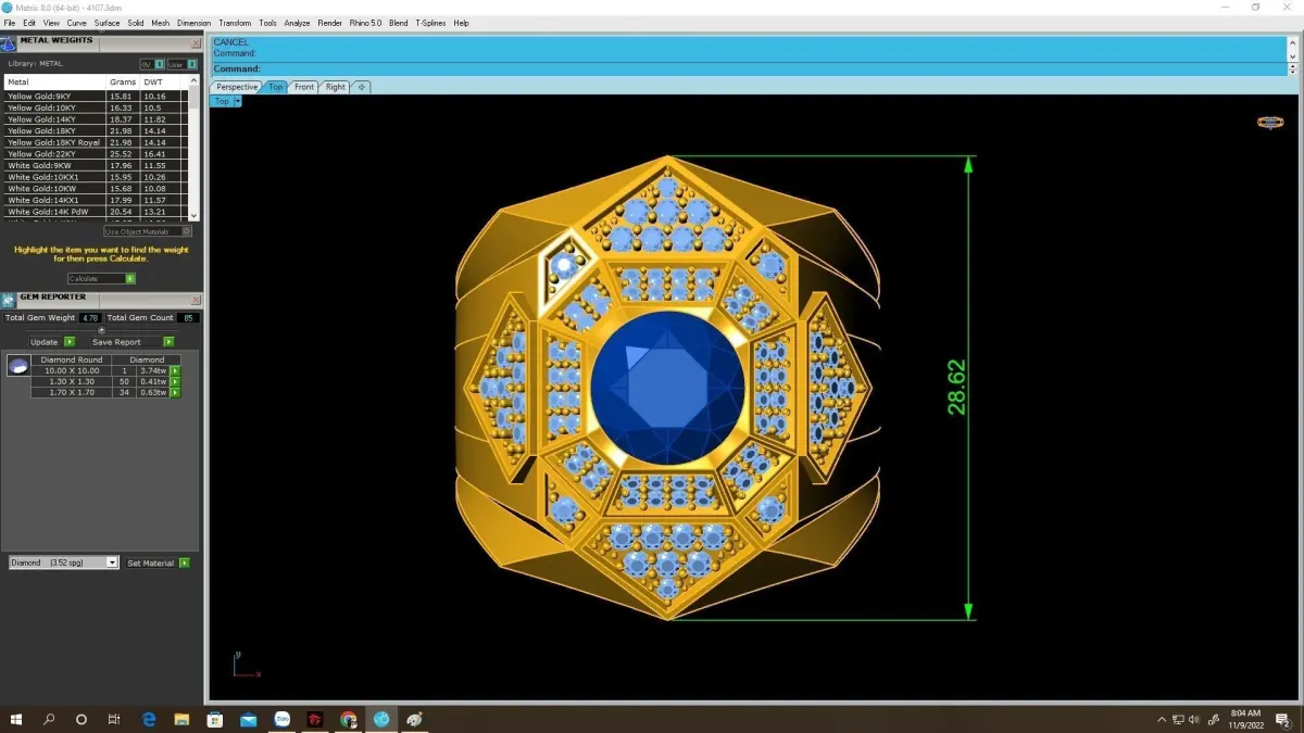 All key technical details, including dimensions, gemstone sizes, stone counts, and estimated metal weight, are clearly displayed in the preview images. This allows jewelers, designers, and manufacturers to accurately evaluate the model before casting.