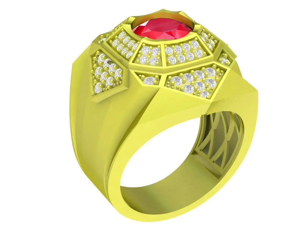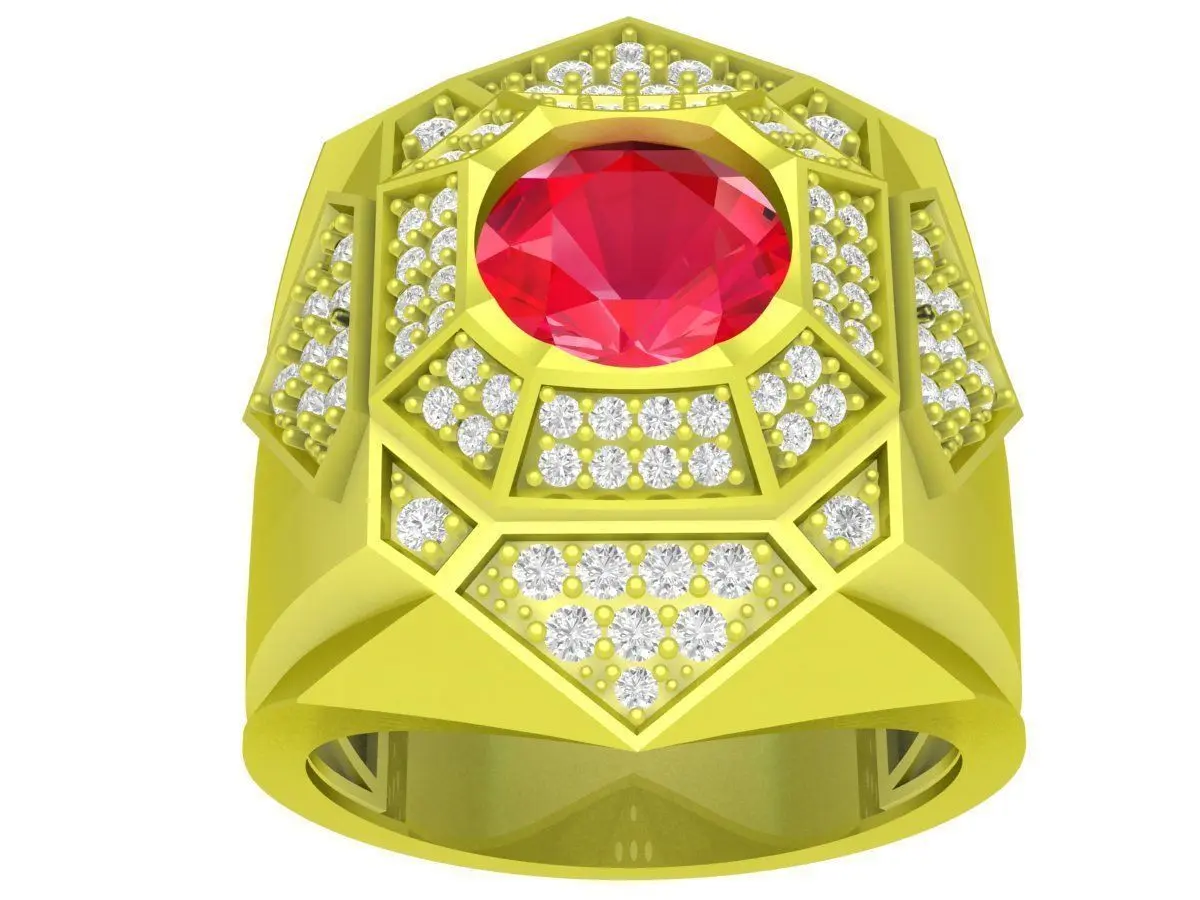 This luxury geometric signet ring is a professional 3D jewelry model designed for premium men’s jewelry manufacturing. The ring features a bold architectural design with a large round-cut ruby at the center, surrounded by precisely arranged brilliant-cut diamonds set within a structured geometric framework.