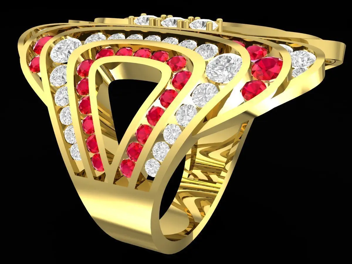 With its modern geometric aesthetic and rich gemstone arrangement, this ring is ideal for statement collections, fashion jewelry lines, high-end gifts, and custom design services. The flowing curves, symmetrical layout, and color contrast make it visually impressive from every angle. This 3D model delivers both artistic expression and practical manufacturing accuracy, making it a valuable addition for jewelers and designers seeking a standout design.