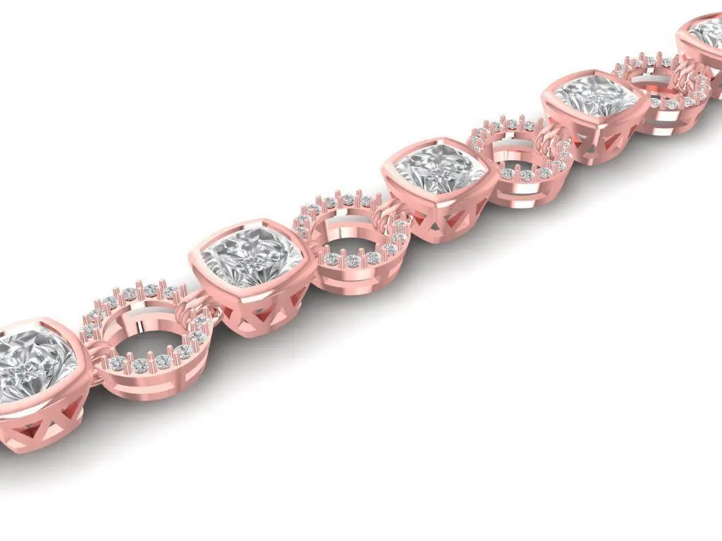 This 3D model presents a luxury gold bracelet featuring alternating cushion-cut stone settings and pavé circular links. Each square element is bezel-set with a large cushion-cut stone, while the round links are fully decorated with sparkling accent stones, creating a balanced combination of brilliance and elegance. The design highlights craftsmanship and luxury, making it a standout piece for premium jewelry collections.