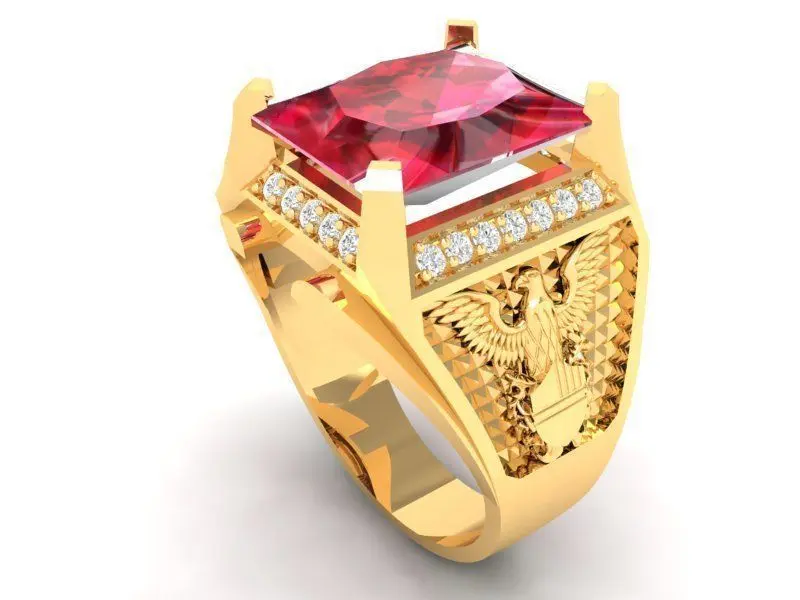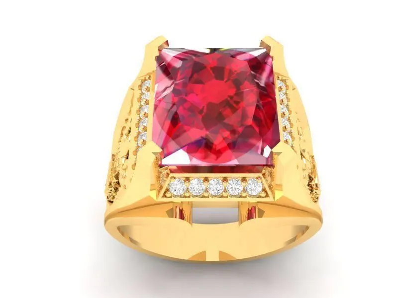This 3D model presents a luxury gold men’s ring featuring a bold square-cut gemstone as the centerpiece. The design highlights variations with vivid emerald green and ruby red stones, securely set in a raised four-prong setting. Decorative engravings along the shank and accent baguette stones on the sides add prestige, craftsmanship, and timeless elegance to the design.