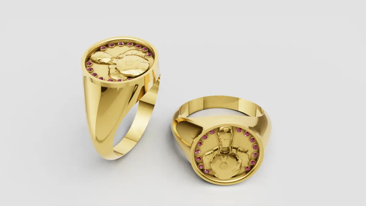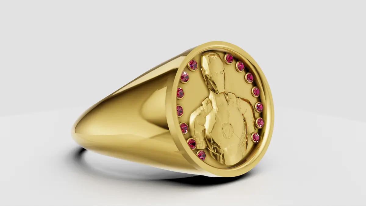 This stunning 3D gold ring design features a bold and masculine aesthetic with a detailed engraving of a heroic figure on the top surface, likely inspired by a futuristic or superhero theme. The circular face of the ring is encircled by precisely set brilliant-cut pink gemstones, adding a touch of luxury and vibrant color contrast to the polished gold band. The high-polish finish enhances the depth and detail of the engraved centerpiece, creating a powerful statement piece ideal for custom jewelry manufacturing, 3D printing, or digital rendering projects. Perfect for collectors or fans of character-inspired fine jewelry.