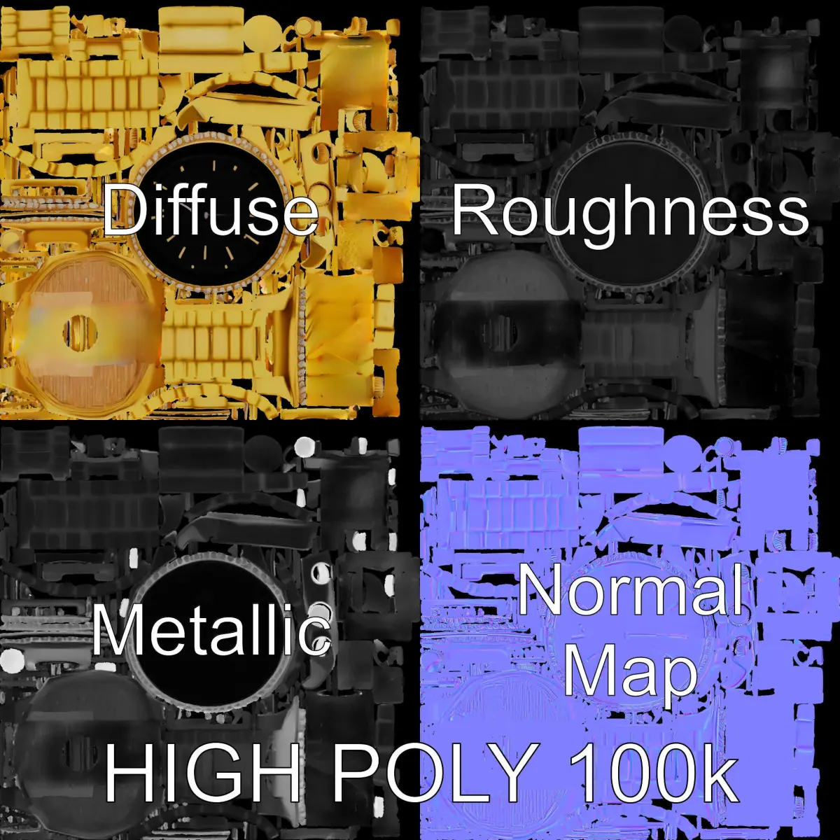 This 3D model pack features a luxury gold watch, offering three levels of detail: low-poly, middle-poly, and high-poly, optimized for diverse applications including mobile interfaces, environmental design, and high-quality production rendering. Ideal for game engines like Unity and Unreal, and perfect for animation and interactive presentations. The model boasts PBR textures with Diffuse, NormalMap, and reflection/roughness/metallic maps, ensuring compatibility with modern engines. Each model is meticulously unwrapped with no overlapping UVs and textures created at 4096x4096 resolution, providing superb realism.