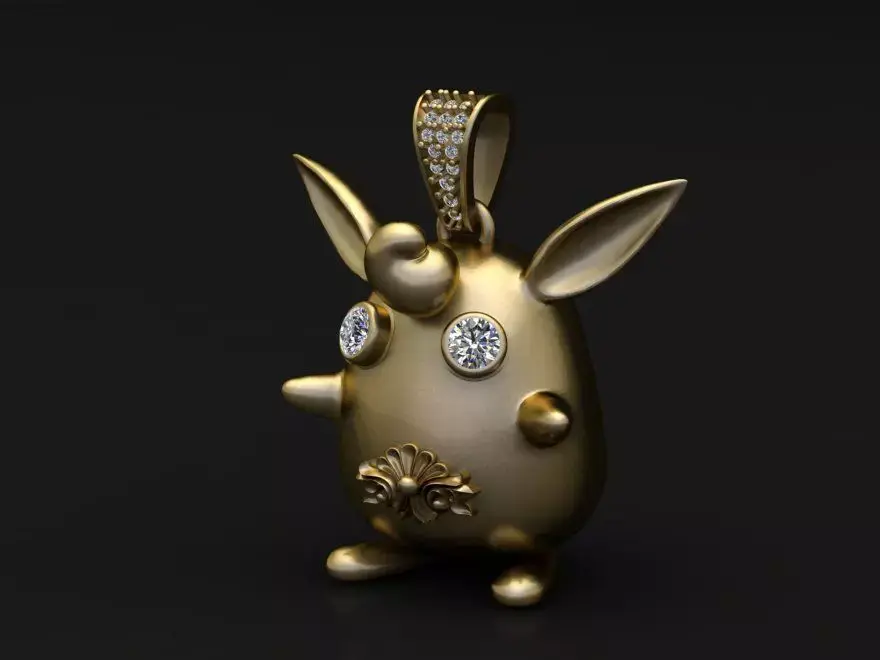 A beautifully crafted golden bunny-inspired pendant featuring sparkling diamond-like accents on the eyes and bail. Designed for both elegance and playfulness, this 3D printable jewelry model is perfect for high-end resin or metal printing.