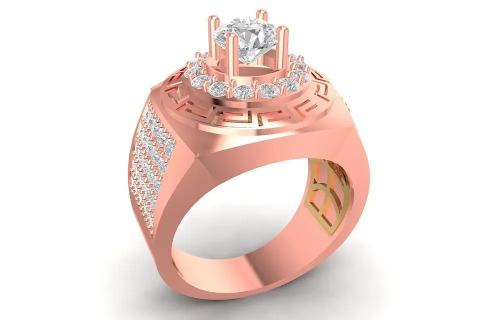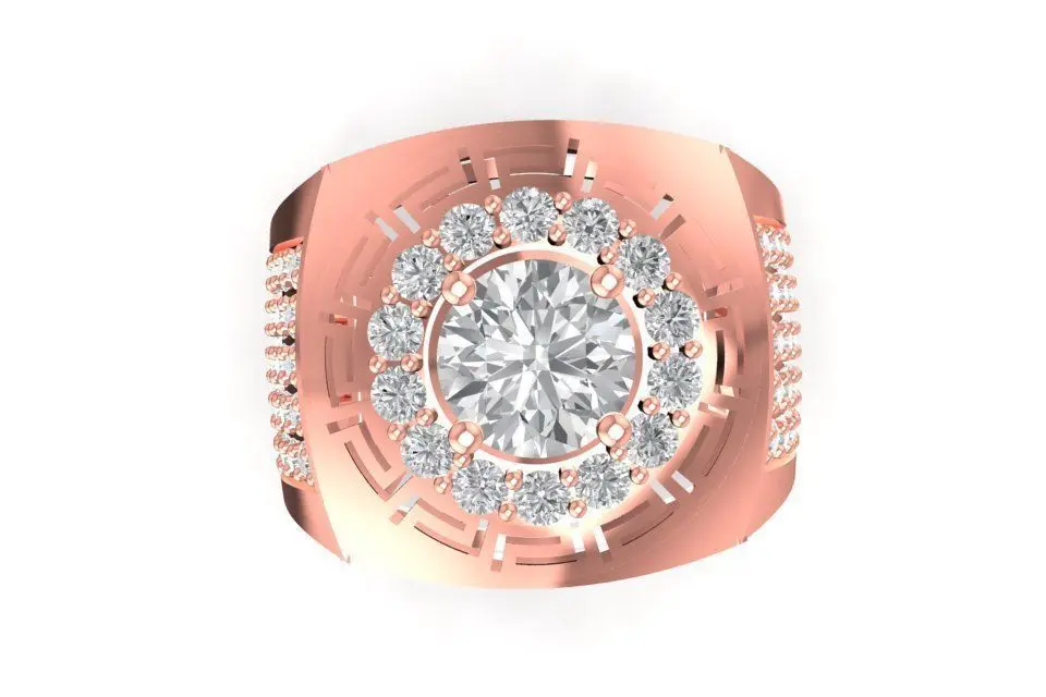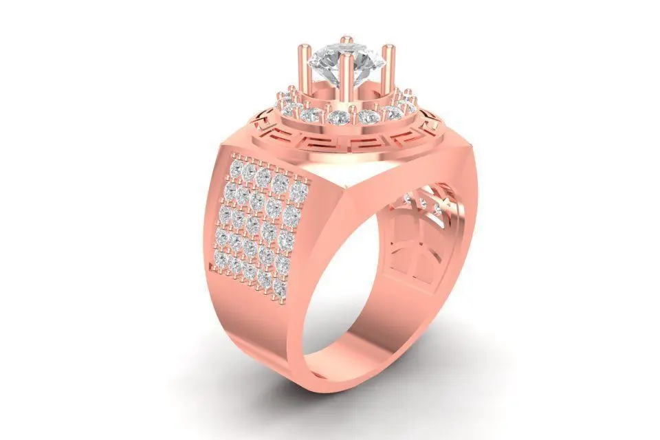 This 3D jewelry model features a bold and masculine men’s ring inspired by the iconic Greek key pattern, symbolizing strength and eternity. The square top holds a brilliant round-cut diamond, surrounded by a geometric frame and detailed pavé-set stones on the sides. The balance of solid metal surfaces and intricate diamond settings creates a luxurious and powerful aesthetic.