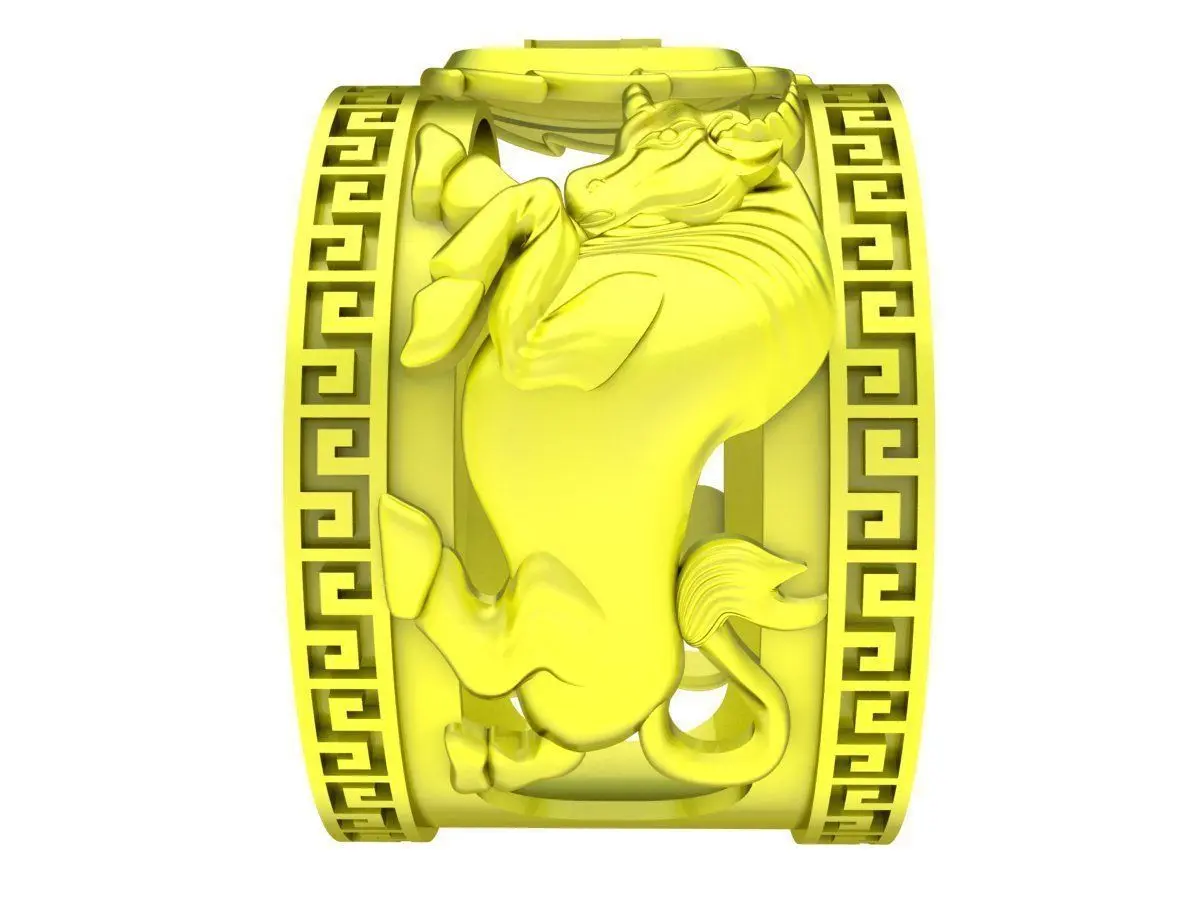 This 3D jewelry model features a bold luxury men’s signet ring inspired by classical Greek key motifs and powerful symbolic detailing. The centerpiece displays a circular emblem with engraved letters, surrounded by a refined textured background that enhances depth and visual strength.