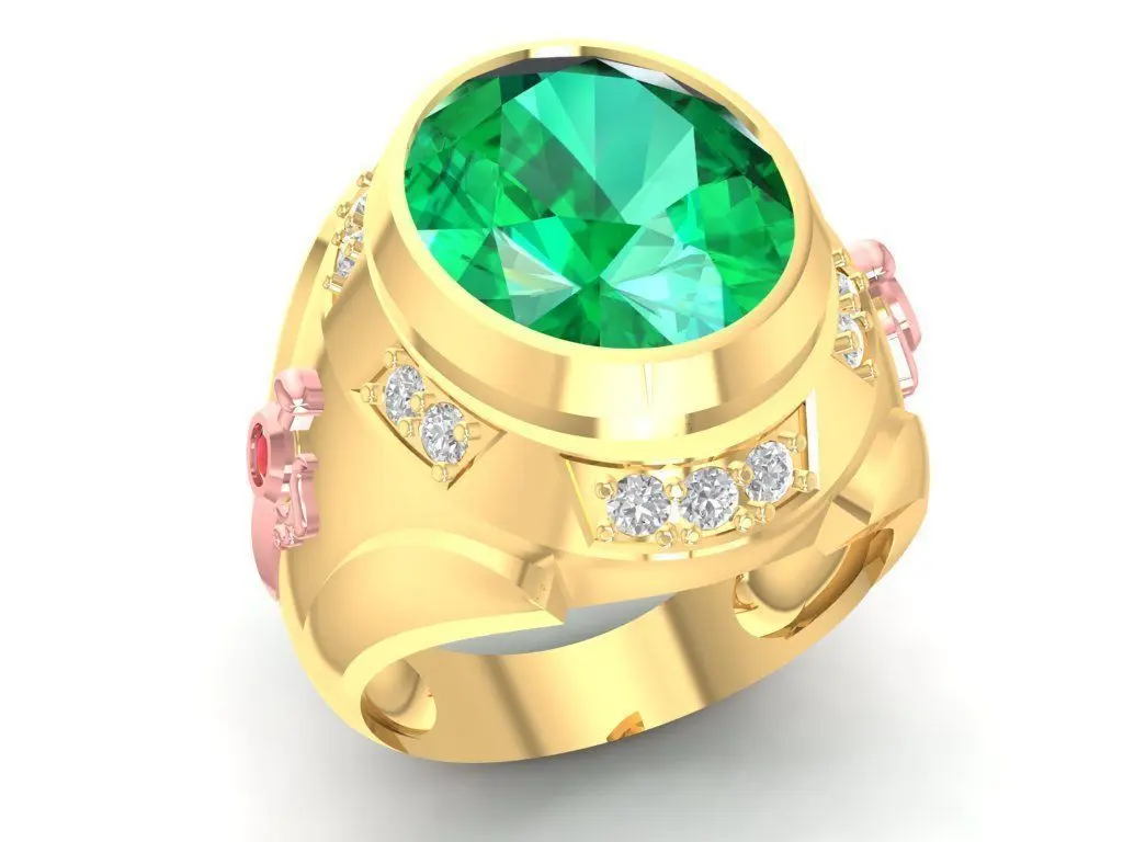 This 3D model showcases a luxurious men’s ring featuring a vivid green central gemstone surrounded by diamond accents and side details set with pink stones. The combination of contrasting colors gives this design a striking and noble appearance, making it suitable for collectors or high-end jewelry clients.
