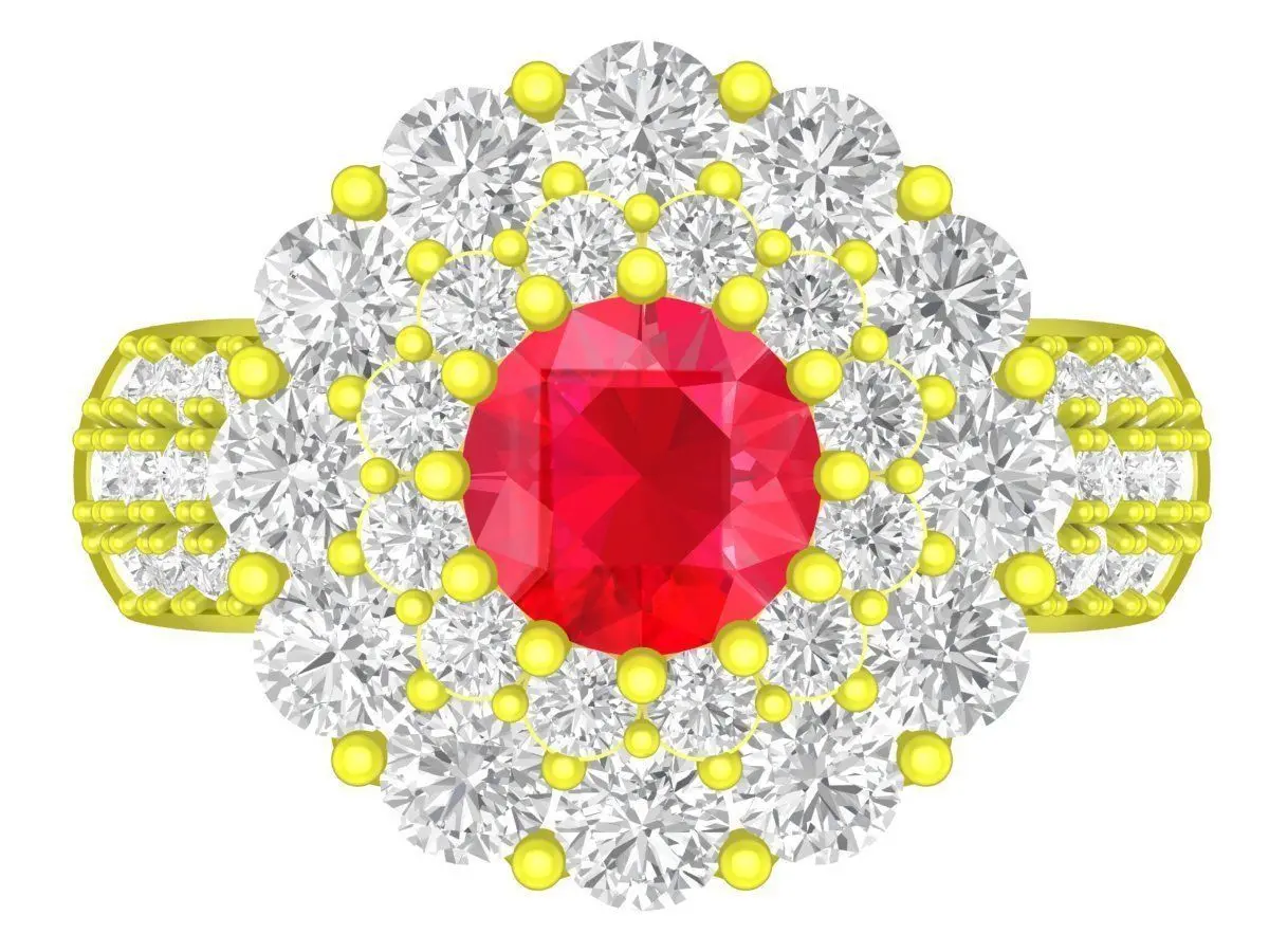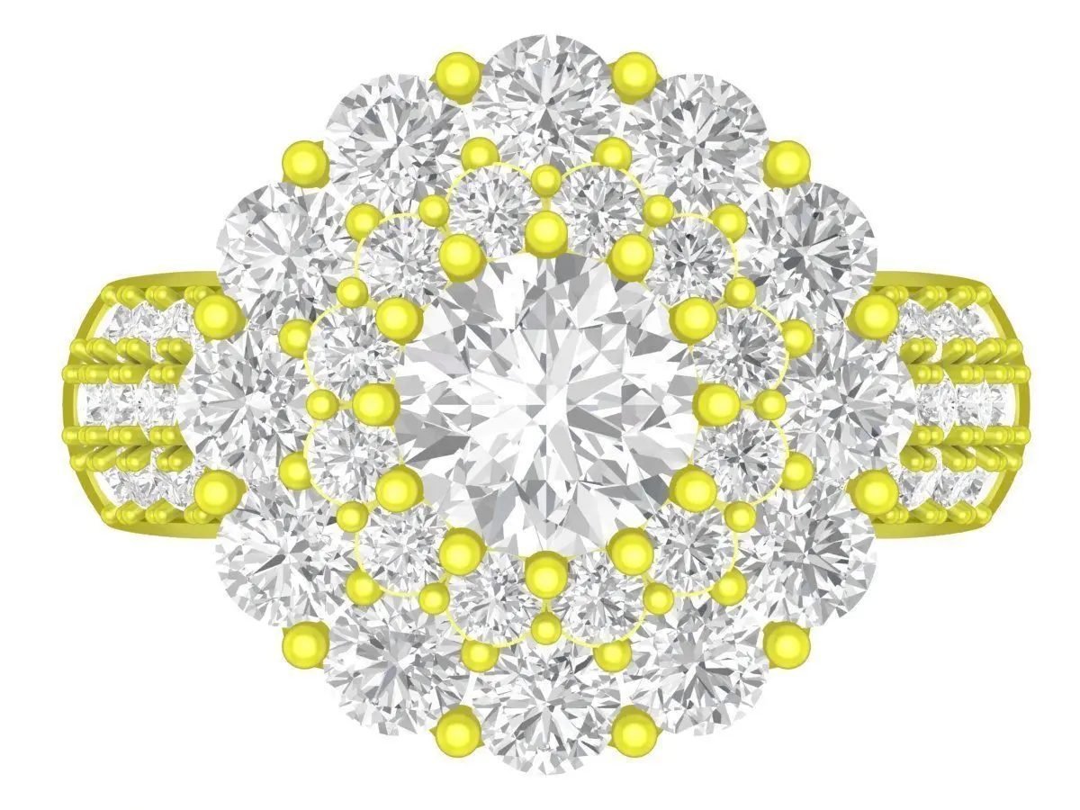 This luxury halo cluster ring 3D model features a rich floral-inspired design with a prominent round center stone surrounded by multiple layers of pavé-set accent stones. The symmetrical cluster layout creates a strong brilliance effect and a refined, elegant appearance.