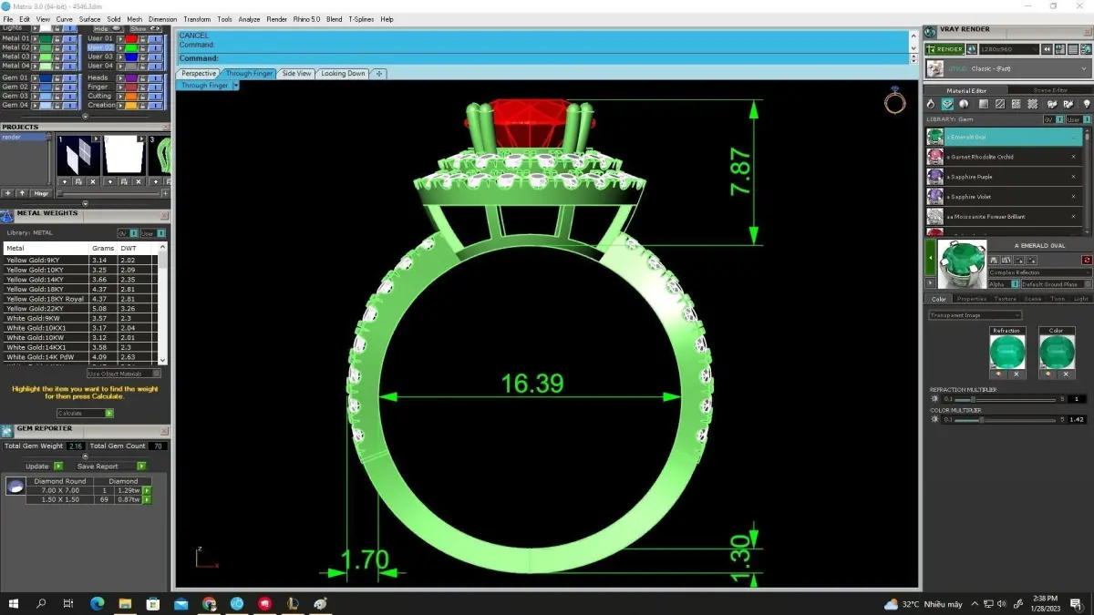 All preview images include complete technical information such as dimensions, thickness, stone layout, and metal weight. The model is optimized for jewelry manufacturing and supports gold or silver production.