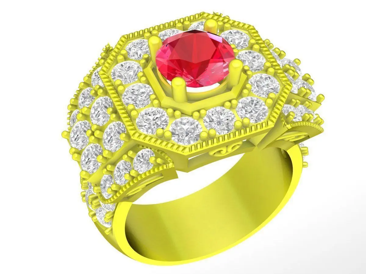This luxury halo gemstone men ring features a bold and powerful design with a large round center stone surrounded by multiple layers of pavé-set accent stones. The wide band and elevated setting create a strong visual presence, making this ring ideal for statement jewelry and high-end men’s collections.