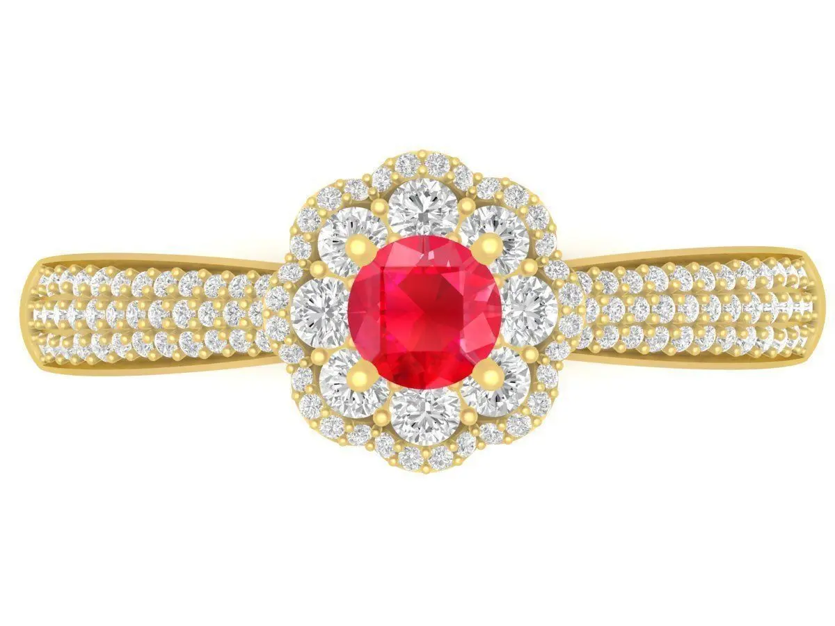 This is a professional 3D jewelry model of a luxury halo ring featuring a round red center stone surrounded by a delicate halo of pavé diamonds. The design emphasizes the vibrant center stone while enhancing brilliance and elegance through precisely arranged accent stones.