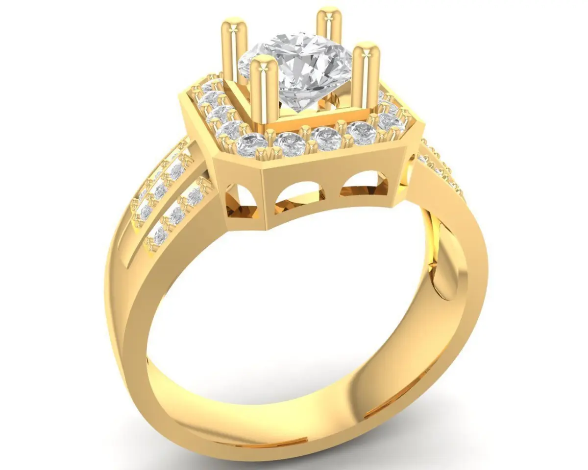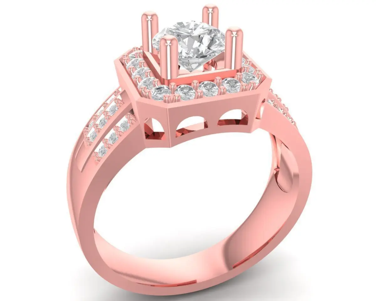 This luxury halo square diamond women ring features a bold center setting designed to hold a large round brilliant stone, surrounded by an elegant multi-layer square halo. The stepped halo structure enhances brilliance, creating a powerful and modern high-end aesthetic. The ring also includes additional side stones along the shank, adding depth, symmetry and refined sparkle from every viewing angle.