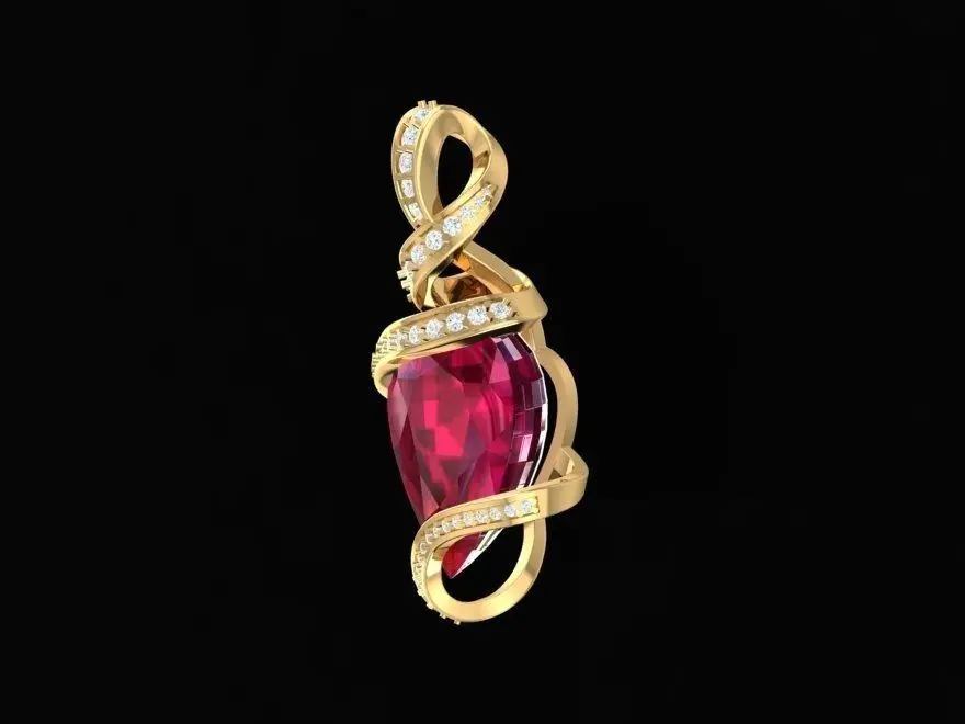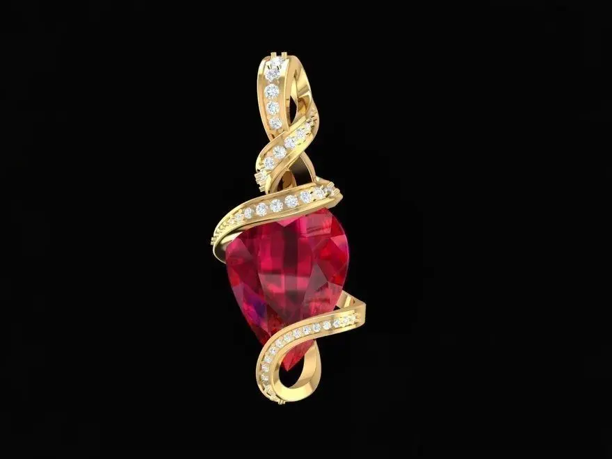 This 3D jewelry model features an elegant heart shape pendant wrapped with a twisted golden ribbon, symbolizing passion and eternal love. The design is ideal for women who adore romantic and luxurious jewelry. The main gemstone is a pear-cut heart in vivid red, perfectly balanced by a curved band set with small diamonds or cubic zirconia for extra brilliance.The model is suitable for 3D printing, CNC machining, and jewelry production. All technical details such as dimensions, stone sizes, and weights are clearly shown in the attached render images. Perfect for jewelers and designers looking for a refined and realistic pendant design.