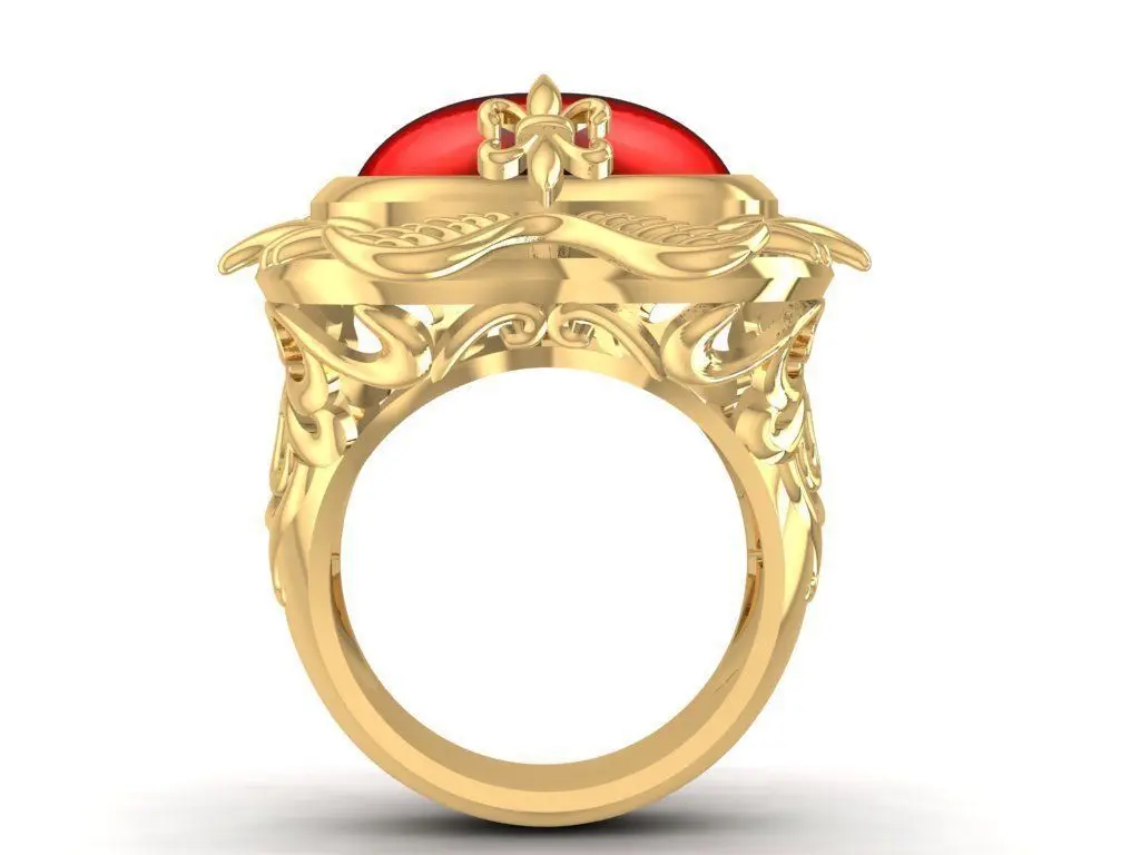 This luxurious 3D model presents a heart-shaped ruby diamond ring designed for women, featuring a vivid red gemstone set in the center and surrounded by a brilliant halo of small diamonds. The ring showcases a graceful filigree-style gold band, creating a romantic and royal aesthetic that highlights the heart symbol of love and passion.