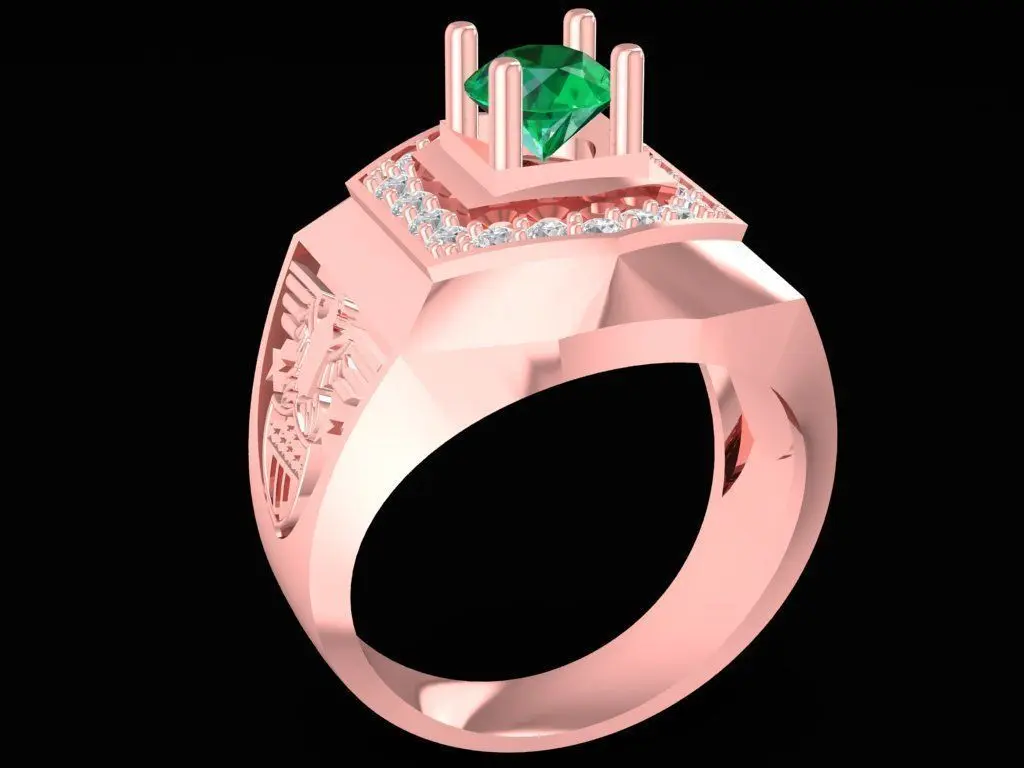 This Luxury Hexagon Green Gemstone Men Ring 3D model combines bold geometry with timeless elegance. The central hexagon-cut green gemstone is framed by sparkling accent stones, creating a powerful visual contrast that symbolizes strength and sophistication.