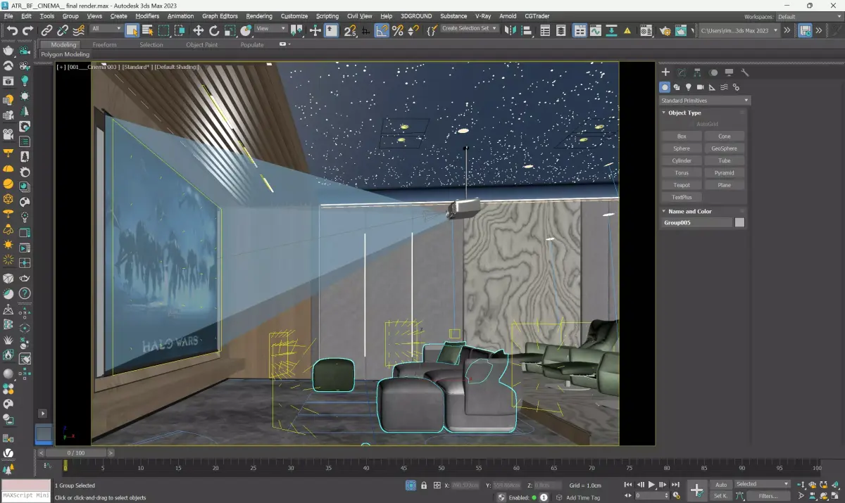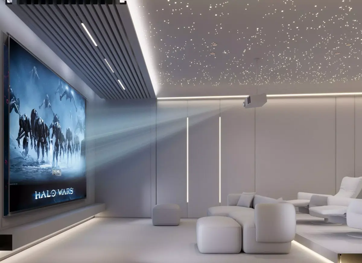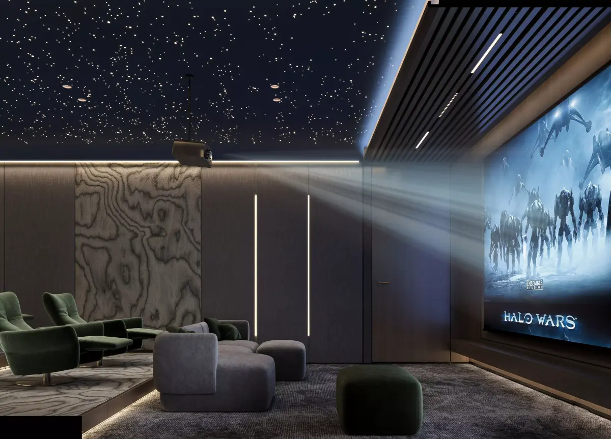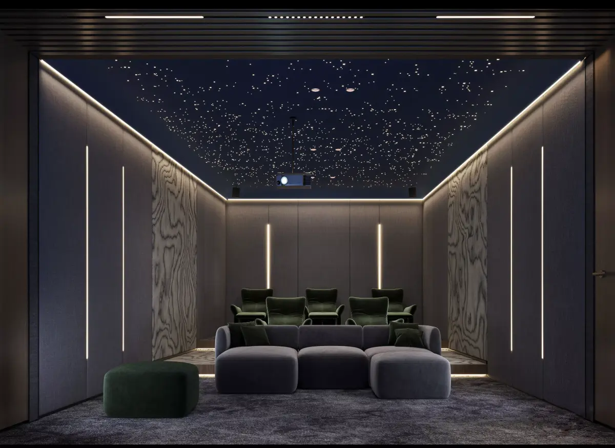 This is a high-end, realistic 3D model of a luxury home cinema room designed for a modern private villa.The scene includes detailed interior architecture, ceiling design with LED lighting, luxury recliner seating, sound panels, acoustic wall cladding, decorative wall lights, and a large screen setup.