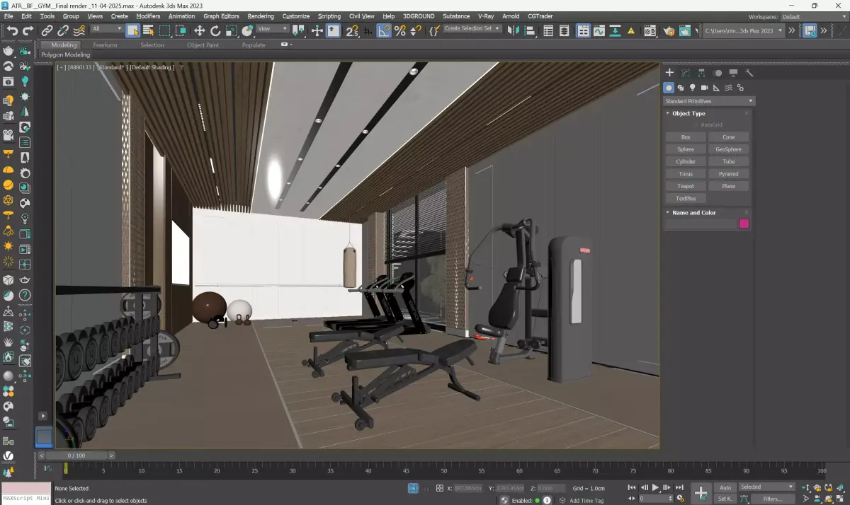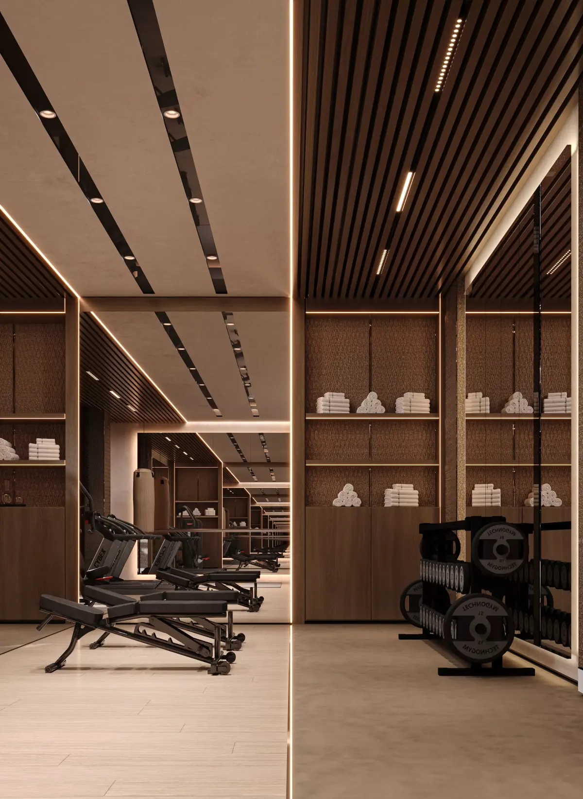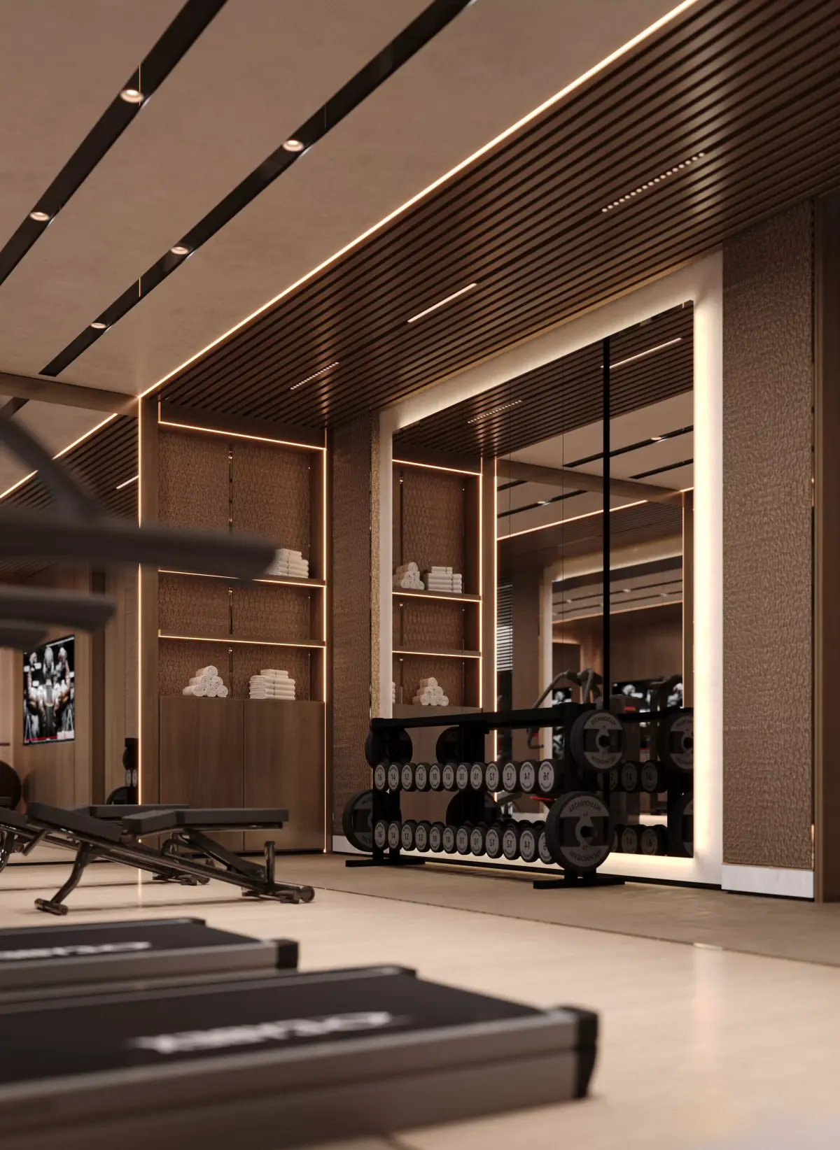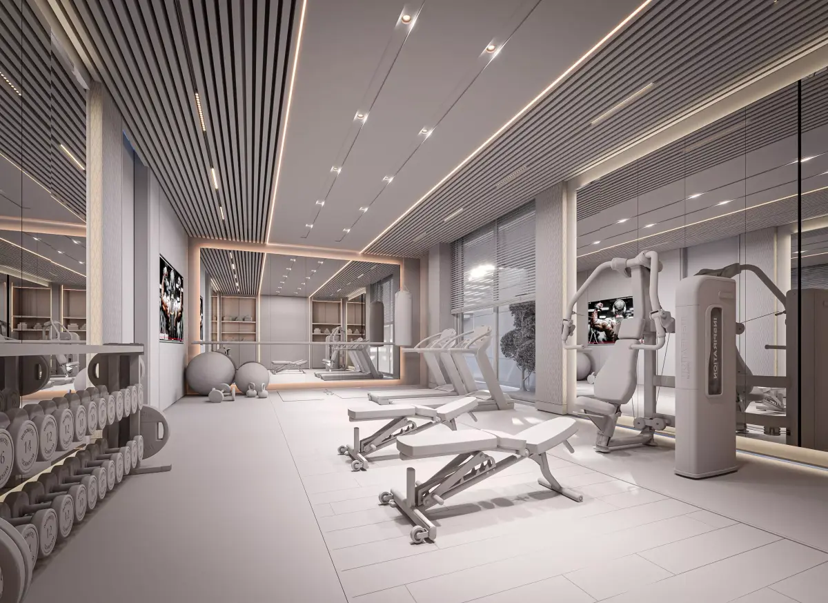 This 3D model showcases a luxurious home gym interior, ideal for modern villas and high-end residential projects. The model includes a variety of gym equipment: treadmill, weights, bench, bike, and wall bars. Lighting is carefully planned using recessed ceiling lights and indirect LED strips for a realistic ambiance. The textures are PBR-based for maximum realism.