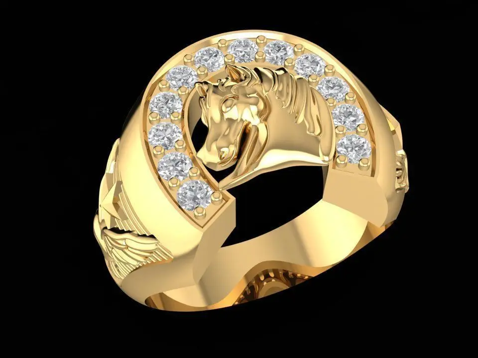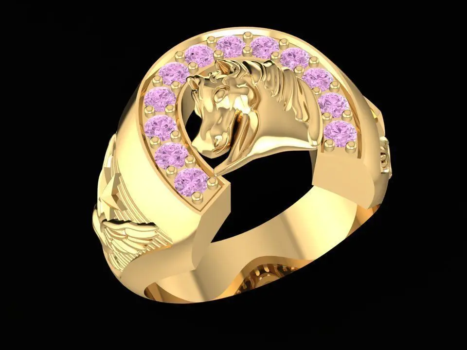 This luxury horse head gemstone ring features a bold design with detailed horse engraving and sparkling stones set in an arc. Symbolizing strength, luck, and success, this 3D jewelry model is crafted with precise dimensions for professional use. Perfect for men’s statement jewelry, it can be customized in gold, silver, or platinum. Includes STL and 3DM files for manufacturing or rendering.