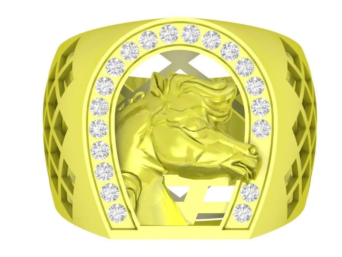 This luxury horse head signet ring 3D model features a bold and masculine design with a detailed sculpted horse head as the central motif. Surrounding the main emblem is a refined gemstone setting that enhances visual contrast and adds a premium finish to the overall composition. The ring combines symbolic strength, elegance, and craftsmanship, making it ideal for statement men’s jewelry.